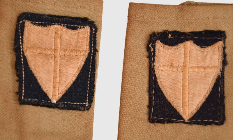 A pair of KD slip on 8 th army titles, machine embroidered titles white on blue, with the yellow central cross faded stitched to a pair of khaki drill slip on.