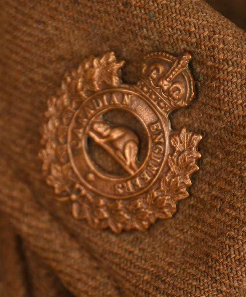 A very good M 1902 tunic from a member of the Canadian engineers. Attached to the tunic is the honourable service World War I badge to Canada individually numbered on the back 79940 which has been identified to Robert Henshaw born June 1889, enlisted September 1914 in the 5th Battalion the Canadian Expeditionary Force known as the CEF, who arrived in France February 1915, he was part of the first Canadian division and was attached to the Canadian engineers first and second field companies, wounded in the head close to Hill 70 near Loos, discharged February 1919 as unfit for service, blue Engineer over patches to the epaulette with brass Canada shoulder titles, all buttons of the Canada variety, Canadian engineers collar patches, interior markings show the number 114 over WD with broad arrow and L below, nap to cloth thin corporals stripes to both sleeves 2 wound stripes and overseas stripes to opposite sleeve one moth hole to right-hand sleeve and two further small moth holes close to the right hand upper pocket as the tunic is worn, we are given to believe that Henshaw was awarded the MM , but do not have the proof of that.