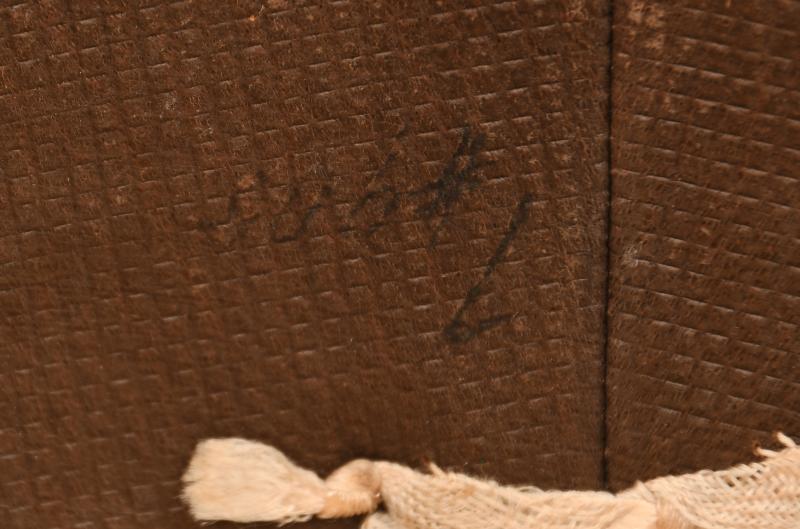 A World War I style cap In light beige colour, produced World War I and worn later with the wider World War II style chinstrap, good trench flopy style fitted with the 1929 badge of the Dominion Fusiliers, maker or retailer stamped into the cross hatched leather sweatband, ”The Muir brand”.