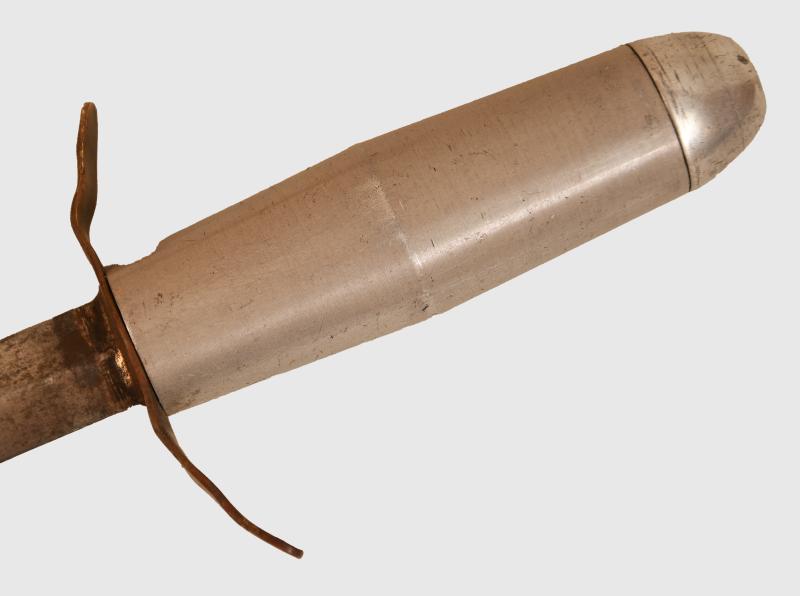 An interesting theatre made combat knife having a 21cm length double edge fighting blade in good condition. Homemade brass cross guard with a grey aluminium hilt with raw aluminium domed pommel. Contained in a highly interesting scabbard, which is construced of webbing over wood with a thick metal throat, cut exactly for this form of double edge blade with a very nicely constructed brown leather belt loop. Brown leather frog with its correct belt attachment and hilt loop.