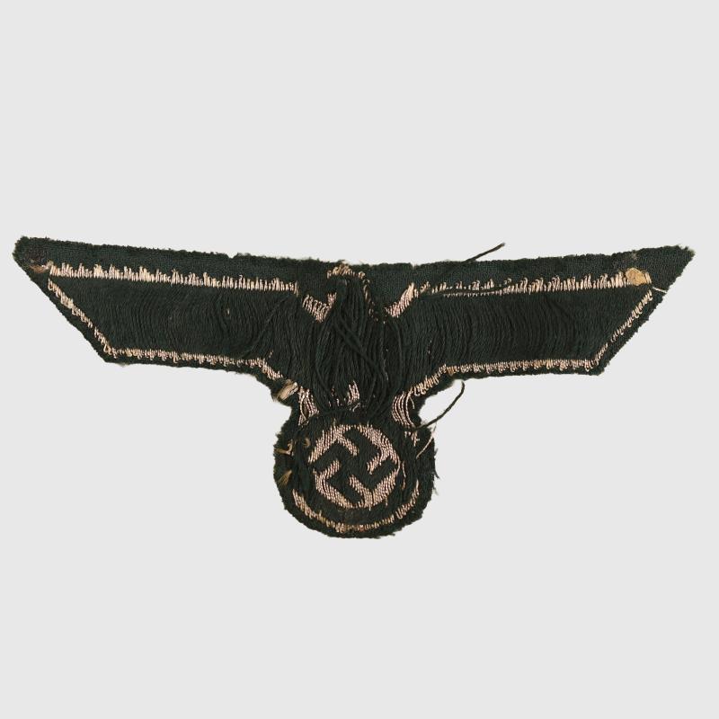 As removed from a cap, the light grey on dark green backing coloured material all woven by the Bevo Company. Stitches remain where removed from a cap.