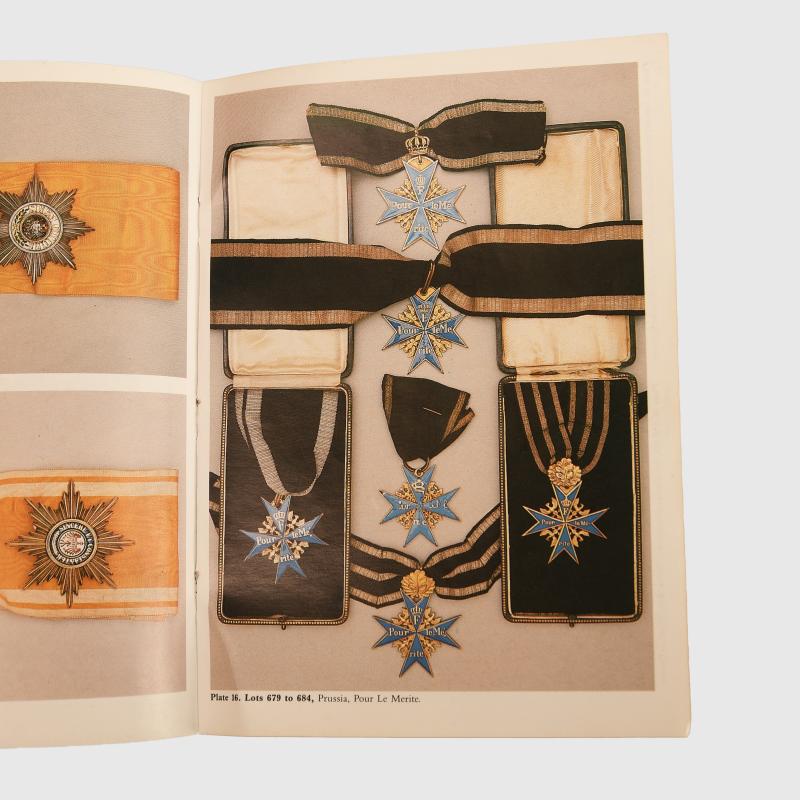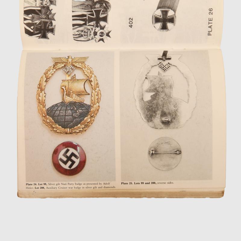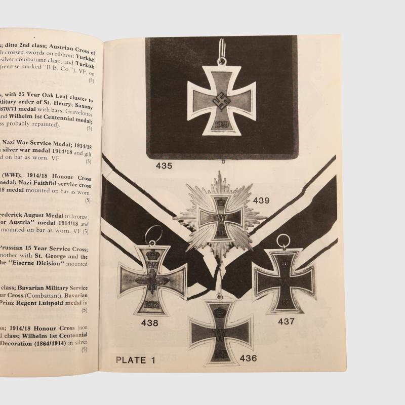 The 1987 catalogue for the sale of the very well known collection of the 1950’s 60’s and 70’s Colonel C.M.Dodkins. One catalogue which comprises part 1 and part 2 together 27th April 1987 and 9th June 1987. 696 items of Imperial German and Third Reich accoutrements, medals, badges, insignia from the Imperial Germany Weimar Republic and Third Reich. Many Biro annotations through the catalogue on prices. A fantastic record of a notable collection, all pictures in black and white with central colour section. Many but not all of the prices realised have been annotated next to the items with other comments. Lot 200 an extremely rare Auxiliary Cruiser War Badge with Diamonds sold for £4,300 A Knights Cross to the Iron Cross with oak leaves sold for £1,700. We attended this sale ourselves.