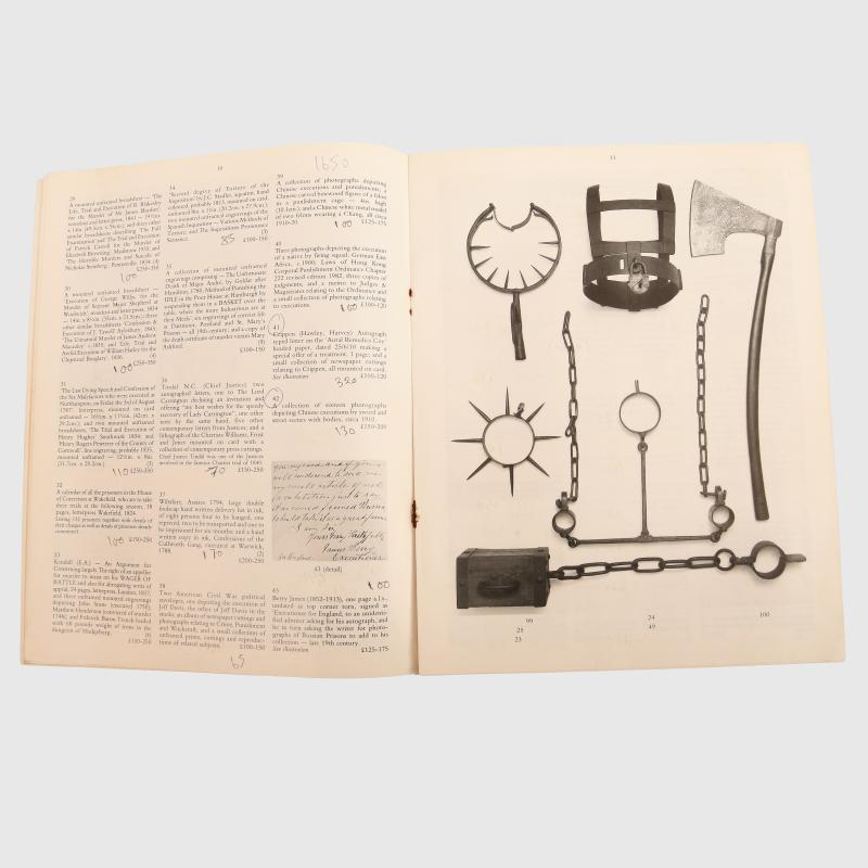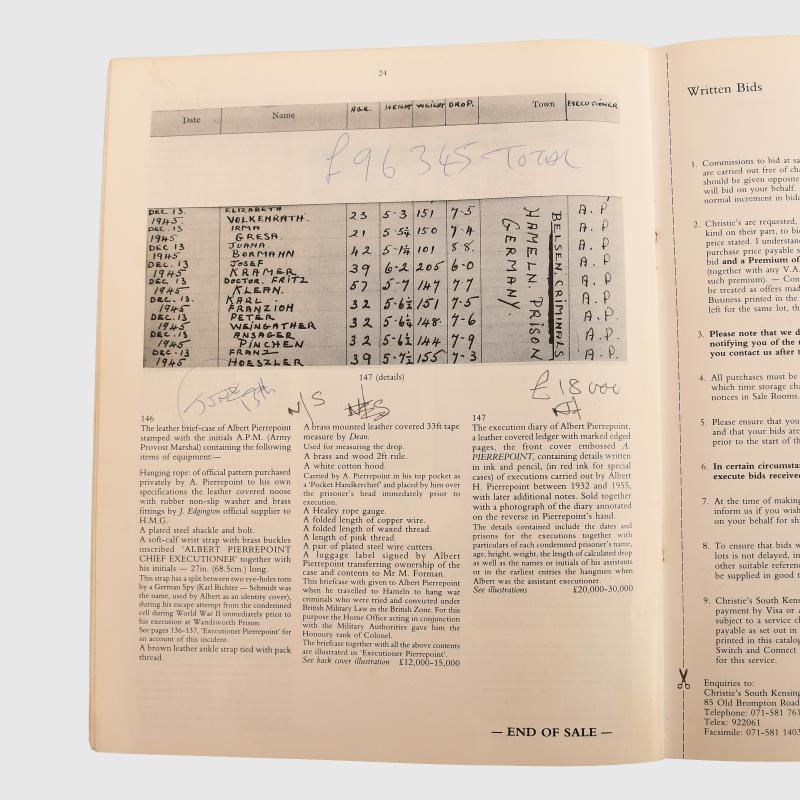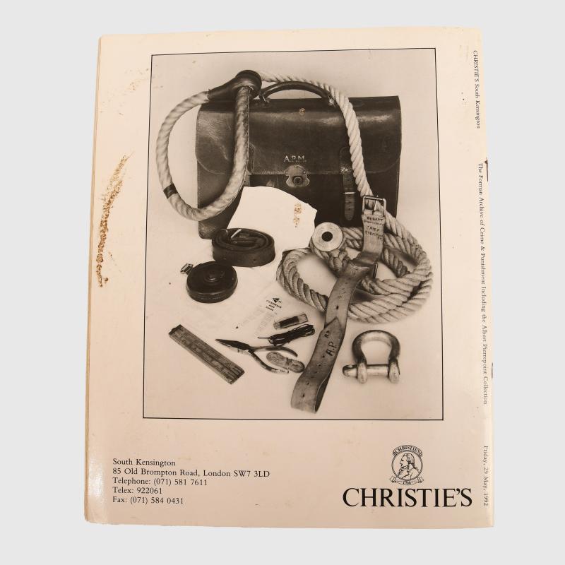 A highly interesting catalogue May 1992 in which Christies sold the complete collection of the Forman family collection Archive of Crime & Punishment including many items that belonged to the British official hangman Albert Pierpoint . 24 pages including lot 147 which was the execution diary of Albert Pierpoint, which include many of the German War criminals hanged at Hamelin prison Many other items of Pierpoint himself, some of which Regimentals purchased including a hangmans rope of official pattern. Anybody interested in crime and punishment of the 20th century would be interested in this catalogue.