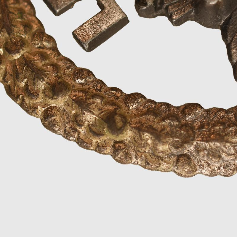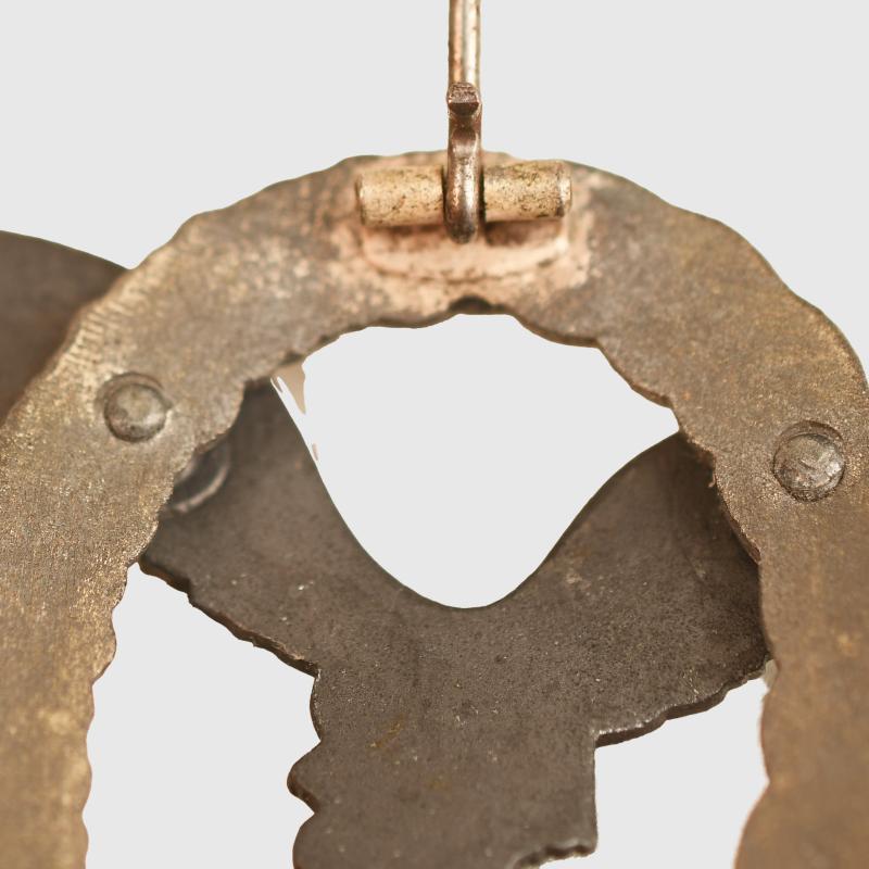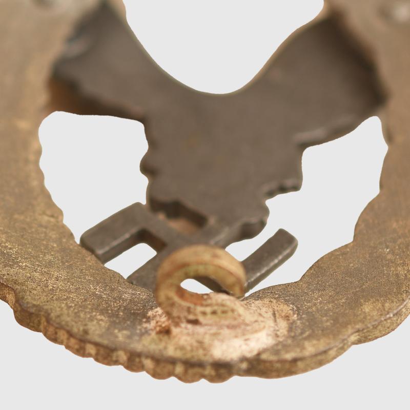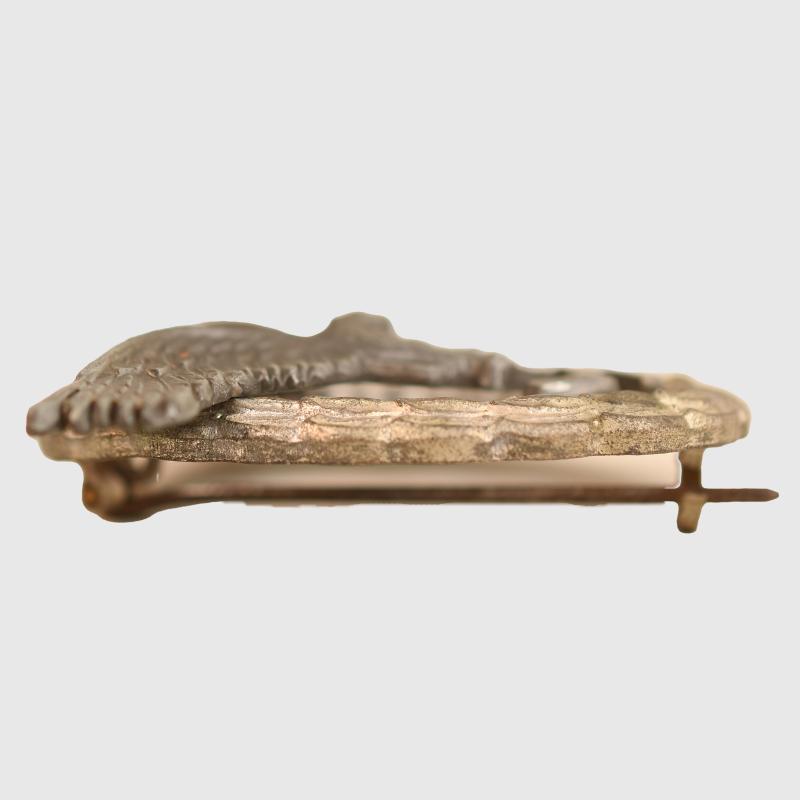 A good example of the mid war quality Luftwaffe Pilots badge, these normally have lost all of their finish and are quite dull and oxidised, this example has virtually all of its silver finish remaining to the oak and laurel leaf wreath. A light grey patinated finish to the Luftwaffe style eagle and swastika. Non maker marked. Two domed rivets on the reverse side, which have lost its silvered finish. Complete with its original pin, hook and hinge.