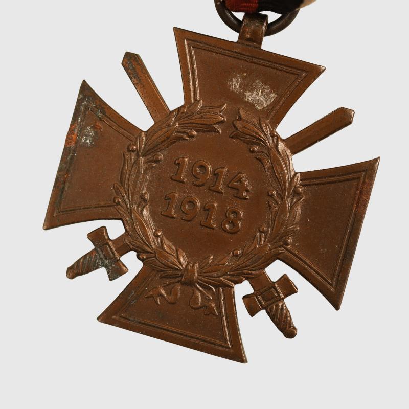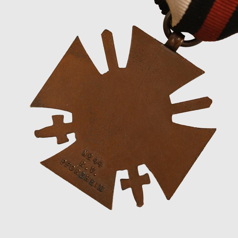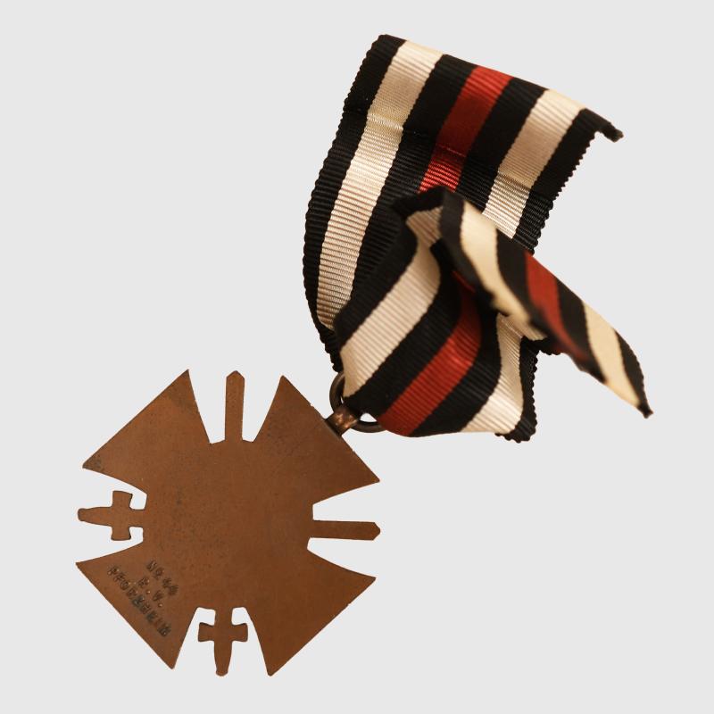 All bronze finish remaining. Maker marked on the reverse side. Correct section of red, white and black ribbon.