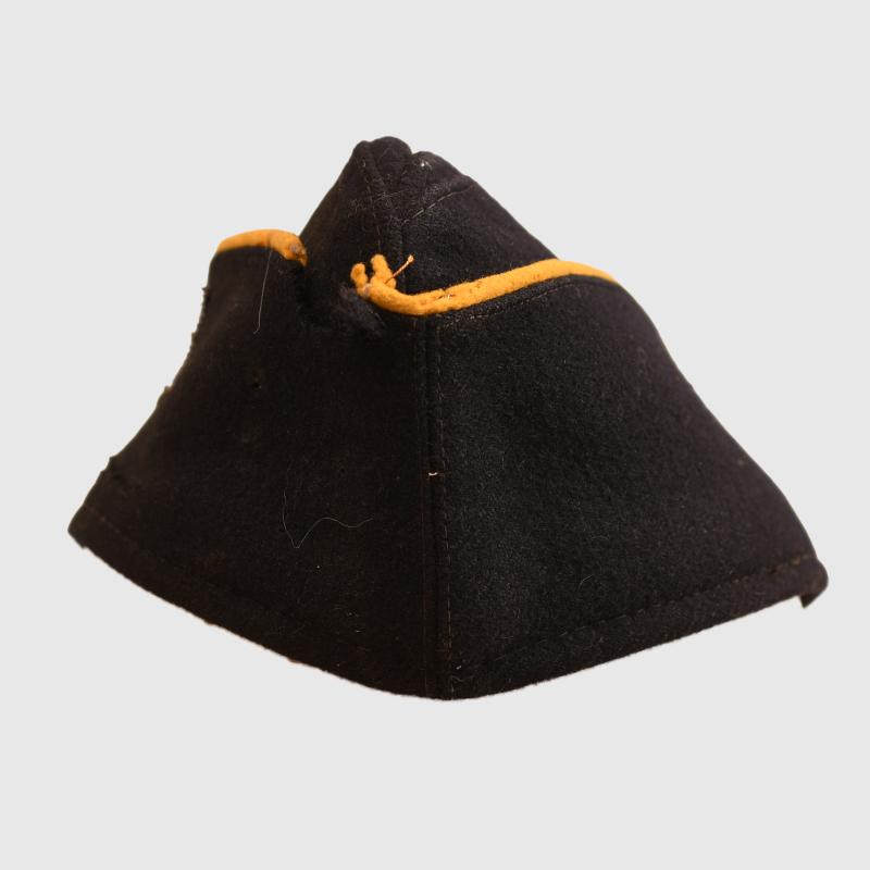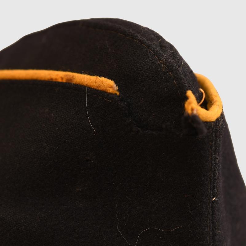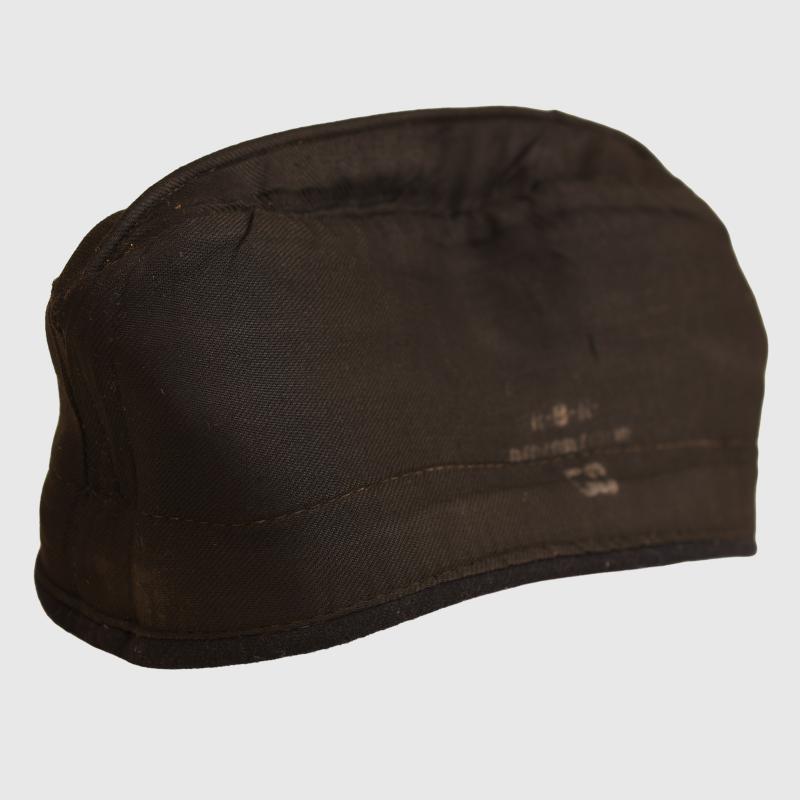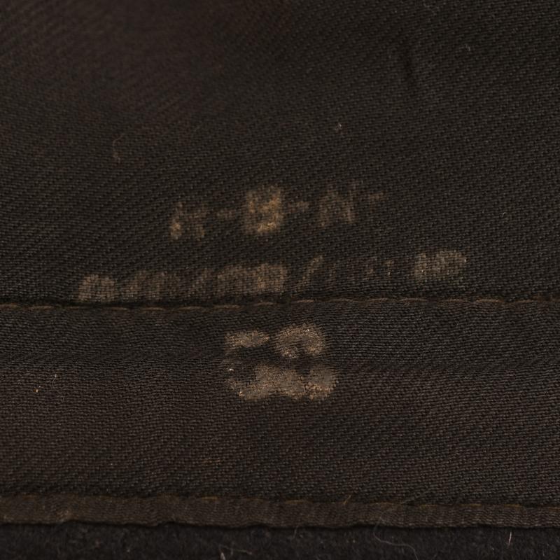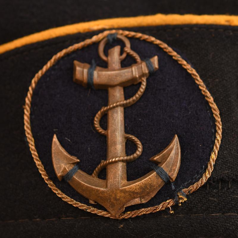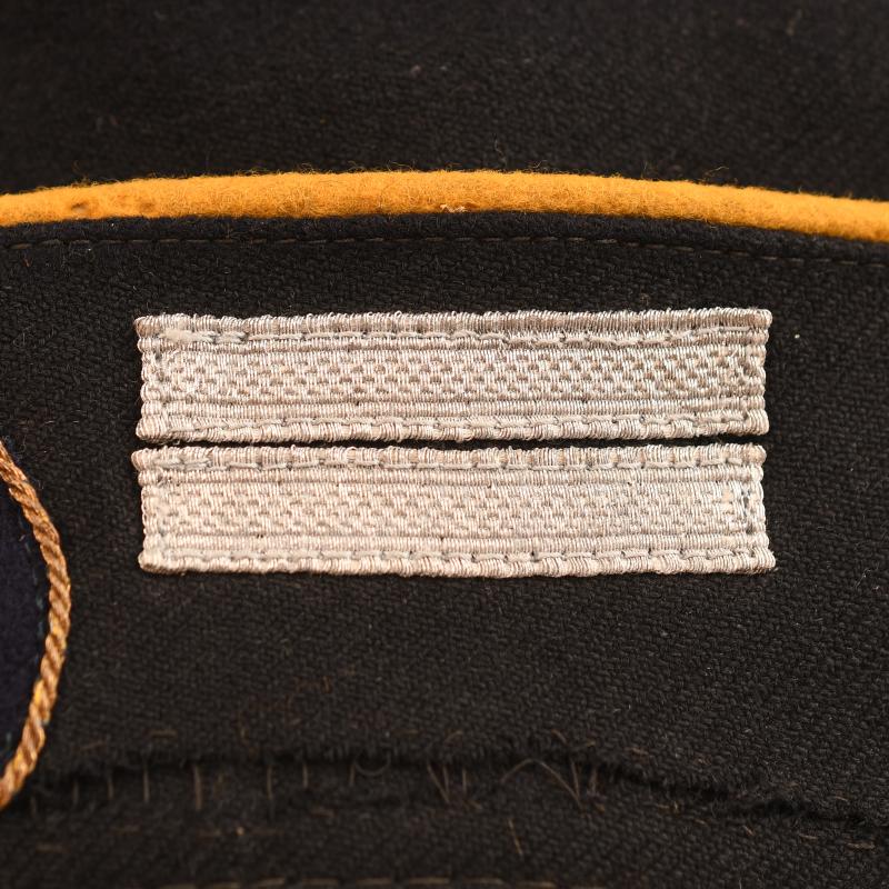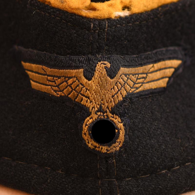 An extremely rare cap of good size either 57 or 58, worn by a Marine Haupthelferin. Standard boat shaped cap with the yellow piping surrounding the whole of the side curtain with the exception of a 2cm section at the reverse of the cap that seems to have been eaten away by a rodent of some form. Slight moth nips to the yellow piping around the front of the cap, with its correct yellow on blue Bevo woven eagle to the lower part of the front. To the left hand side of the cap is a circular section of Navy Blue wool with attached a nice quality fouled anchor with a gold twisted cord edging , two 5.5cm length of tress indicating the rank of Haupthelferin , below the rank lace is a cut in the cap 8 cm in length which has been collector sewn together. To the interior the standard Kriegsmarine style lining, RB numbered with a size that appears to be 58 but is indistinct. An extremely difficult cap to find, never seen before insignia. This has come from a recently acquired over 50 year old collection. It would appear that the ranking system defies official orders, as per page 382 of volume 2 of the excellent work Kriegsmarine Uniforms & Traditions where the rank insignia is described as being in gold, on the same page an image of the naval auxiliaries broach which is a facsimile of the larger size badge on the side of this cap indicating that the wearer may have been a Marine Helferin Auxiliary.