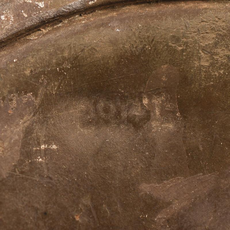 A very good M 17 trench helmet, markings of TJ 66, the exterior shell camouflaged in the classic three colour combination of brown ochre and green with quite wide black separation lines, standard rubbing of the paint to the crown, with its complete cream three part liner with original drawstring, the name of Bierbaume painted in black to the rear inner skirt. More extensive, extra images can be seen on our new Premium website, type in regimentalsmilitaria.co.uk in to your web browser.