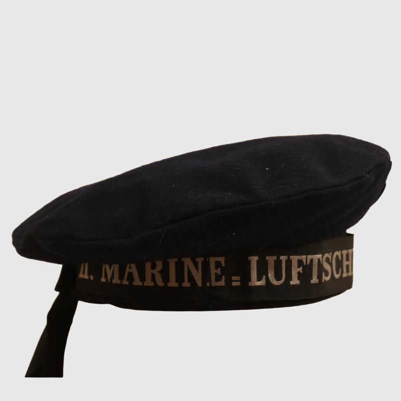 A standard Reich Marine deck cap in blue, excellent condition, no moth or damage anywhere. Small size ‘53’, fitted with the rare cap tally of ‘II.Marine Luftschiffer Abteilung.II in Roman numeral.’ Marked to the inside with a ‘B.A.(possibly R but difficult to read) which would be Reich Marine with the date ‘17th April 14’ with the further block ‘1.M.L.A.’( 1st Marine Luftschiffer Abteilung). Complete with its original leather sweatband and the remains of a paper label. Fitted with its single Reich Marine national cockade, the cap tally has its full length tails. A rare piece of First World War headdress. More extensive, extra images can be seen on our new Premium website, type in regimentalsmilitaria.co.uk in to your web browser.
