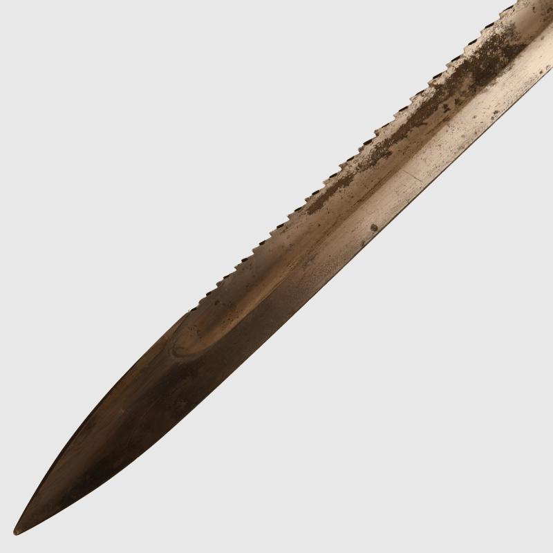 A very fine example of the scarce saw back K.98 bayonet. Maker marked ‘Gottlieb Hammesfahr, Solingen’. A nice clear Imperial acceptance stamp on the flat back section of the blade. The lower cross guard of the bayonet is number stamped ‘430’. Wood grips undamaged. Imperial acceptance stamp just above the rifle retaining button, which is stiff. Fitted into its original scabbard and a very nice condition mid tan leather frog, which is Nuremberg maker marked to the upper loop part with a crown over roman numeral ‘III’ at the lower part of the frog, also the numbers ‘159’. The crown over the roman numeral III maybe the Bavarian Army Corps marking. This was recently discovered in Bavarian. More extensive, extra images can be seen on our new Premium website, type in regimentalsmilitaria.co.uk in to your web browser. The sale of Knives, other Edged Weapons and Firearms are restricted to those aged over 18. Verification of age is required before purchase is concluded, this will include providing a scan of photo ID including your address and in some cases may require video verification by FaceTime or WhatsApp video, at Regimentals discretion, until formal laws on this requirement are enforced in the UK.