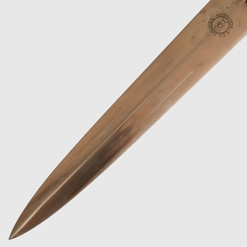 An absolutely superb blade by the unusual maker of ‘F.E.D.Ohliger of Solingen’. All cross grain finish present to the blade, this is an early construction piece with heavy nickel grip mounts, the lower grip mount marked ‘NH’ for the area of Niederrhein The wood grip with minor indentations but nice quality pattern to the wood, Undamaged SA enamel inset. High quality national eagle. All fitted into its correct scabbard with matching heavy nickel fittings to the upper and lower scabbard mounts. A good degree of original brown anodising remaining with spidering coming through from the steel below. Fitted with a very nice leather strap with its spring fully functioning. More extensive, extra images can be seen on our new Premium website, type in regimentalsmilitaria.co.uk in to your web browser. The sale of Knives, other Edged Weapons and Firearms are restricted to those aged over 18. Verification of age is required before purchase is concluded, this will include providing a scan of photo ID including your address and in some cases may require video verification by FaceTime or WhatsApp video, at Regimentals discretion, until formal laws on this requirement are enforced in the UK.