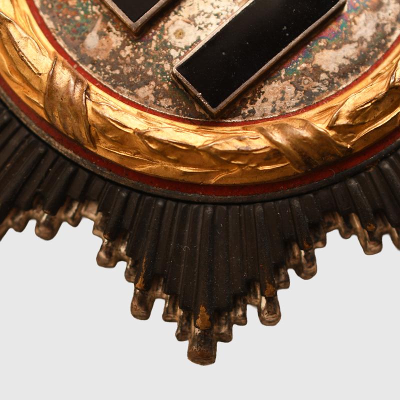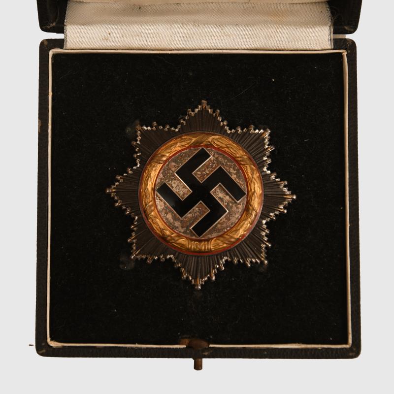 A very nice example of a number ‘20’ marked Zimmermann & Company produced German Cross in gold, classic construction, four domed hollow rivets, wide tapering pin, original hook and hinge. Good gilt remaining to the 1941 dated wreath. Excellent enamels. All of the black finish remaining to the ray and virtually all the silver finish to the star behind the ray. All of the red enamel to the disc underneath the ‘41’ dated wreath intact. Fitted in its original gold lined box, some slight scuffing to the edges of the box and an imprint to the upper inner lid of the wreath of the award. More extensive, extra images can be seen on our new Premium website, type in regimentalsmilitaria.co.uk in to your web browser.