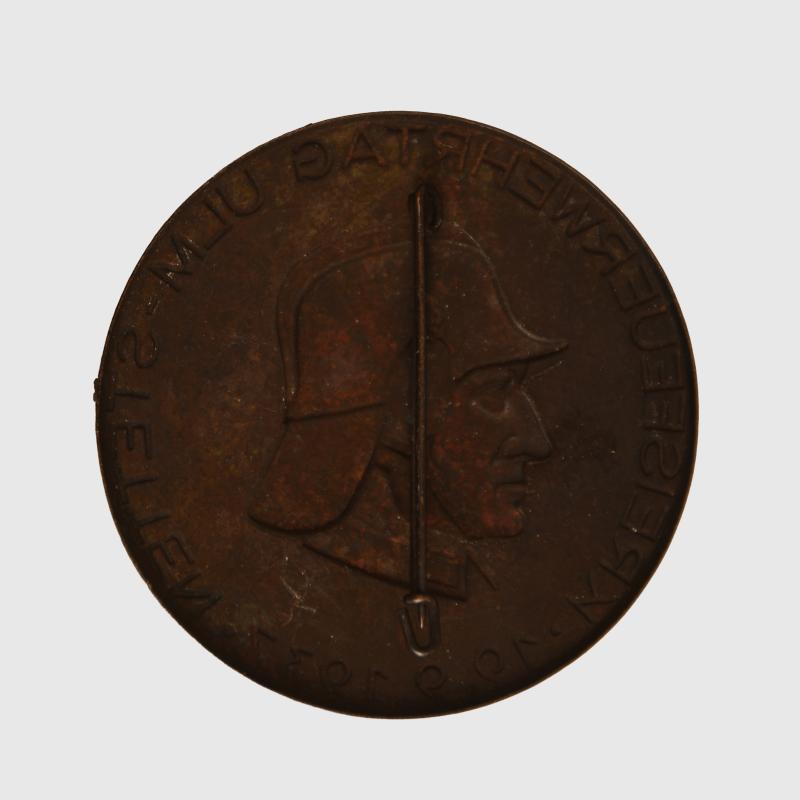 Large circumference tinny with the outline of a German fireman wearing his helmet. Most of the bronze finish remaining.
