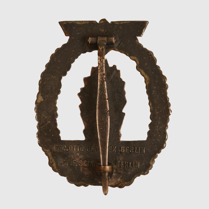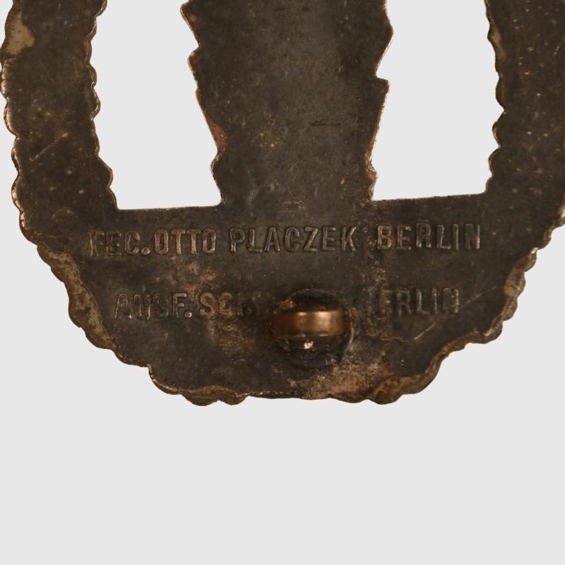 The finish is virtually gone to the wreath, good silvering to the exploding mine, all of the Schwerin finish remaining to the reverse of the award with its original wide tapering pin, original hook and hinge and a full maker’s mark in raised relief.
