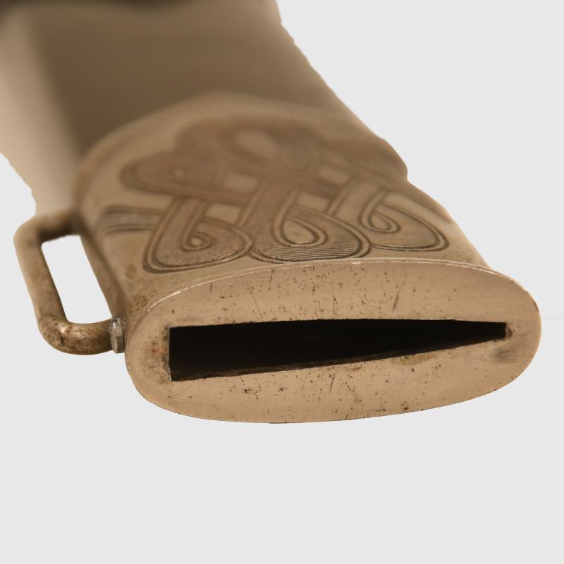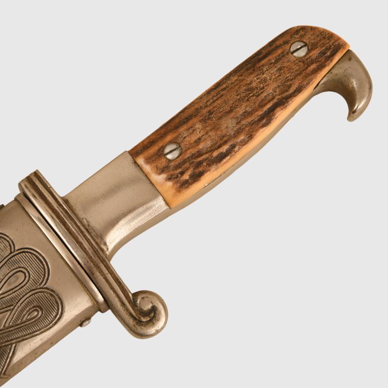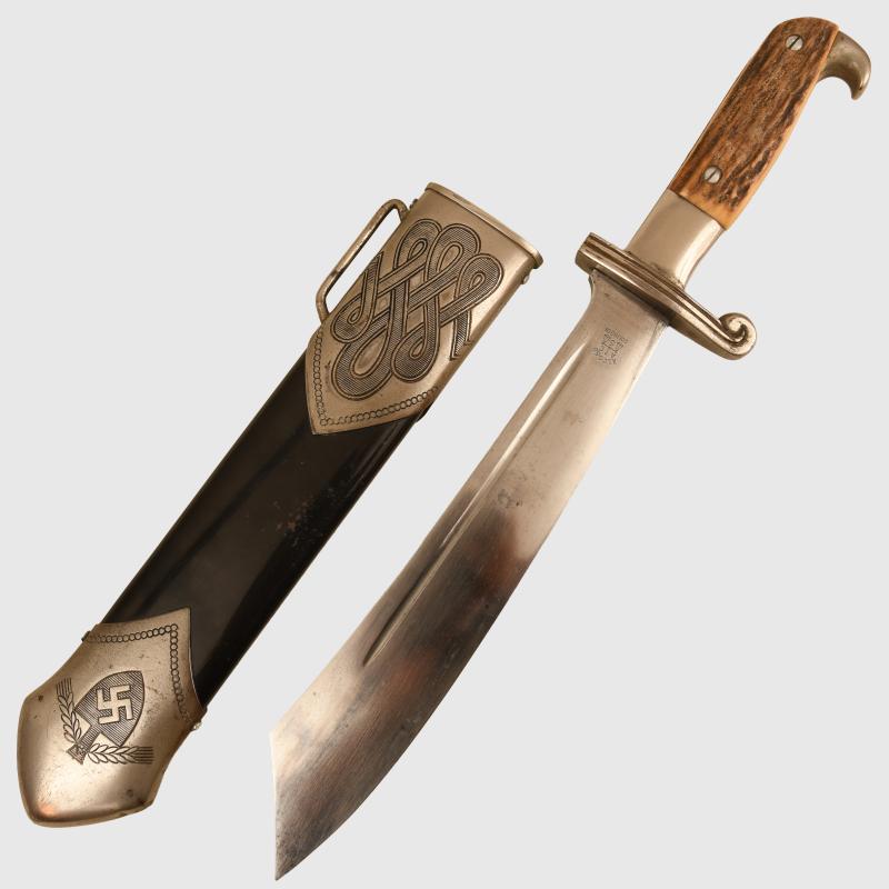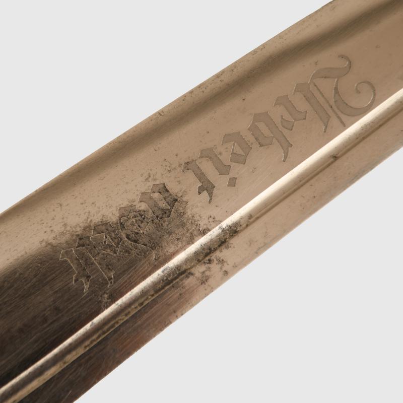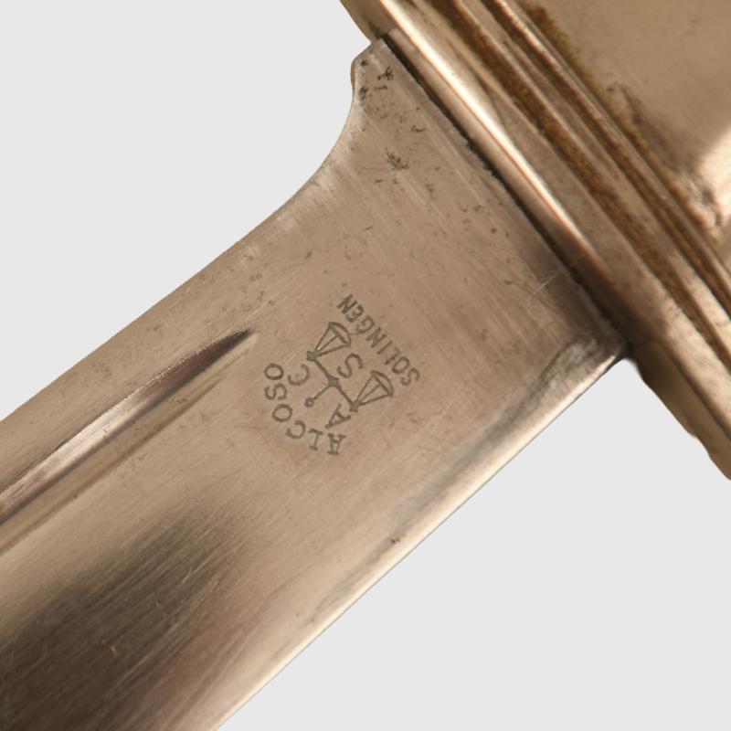 It has always been traditionally difficult to obtain any of the RAD hewers in nice clean condition, this example with a blade by Alcoso having slight scratch marks to the blade but no abusing or reprofiling. Good deep motto of ‘Arbeit Adelt’. The heavy nickel finish to the whole hilt is very good and bright. Undamaged stag grips. Fitted into its correct scabbard, very minor spotting to the plating on the face side of the upper scabbard mount, lower scabbard mount perfect. The centre of the scabbard retains virtually all of its paint finish with slight spidering showing through from the steel below with some minor chips to the edge and on the reverse side. All screws are the correct type and are all intact. A very fine example. The sale of Knives, other Edged Weapons and Firearms are restricted to those aged over 18. Verification of age is required before purchase is concluded, this will include providing a scan of photo ID including your address and in some cases may require video verification by FaceTime or WhatsApp video, at Regimentals discretion, until formal laws on this requirement are enforced in the UK. More extensive, extra images can be seen on our new Premium website, type in regimentalsmilitaria.co.uk in to your web browser.