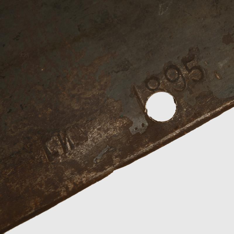A very nice condition 1895 dated entrenching tool, which is marked ‘K.III’ with twin letters ‘LM’. A drilled hole through one part of the tool head. Excellent wood haft. Fitted into its original German brown leather entrenching tool cover, of which the stitching is all strong, one of the loops appears to have had a period replacement with re-issue marks of ‘SA’ within a rectangle to the Finnish Forces.