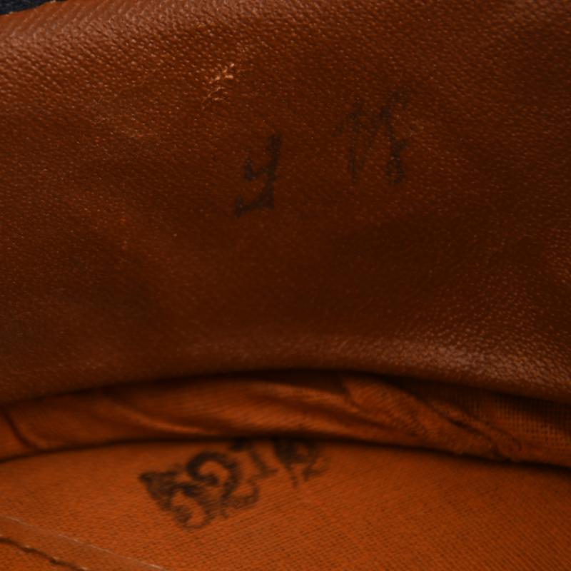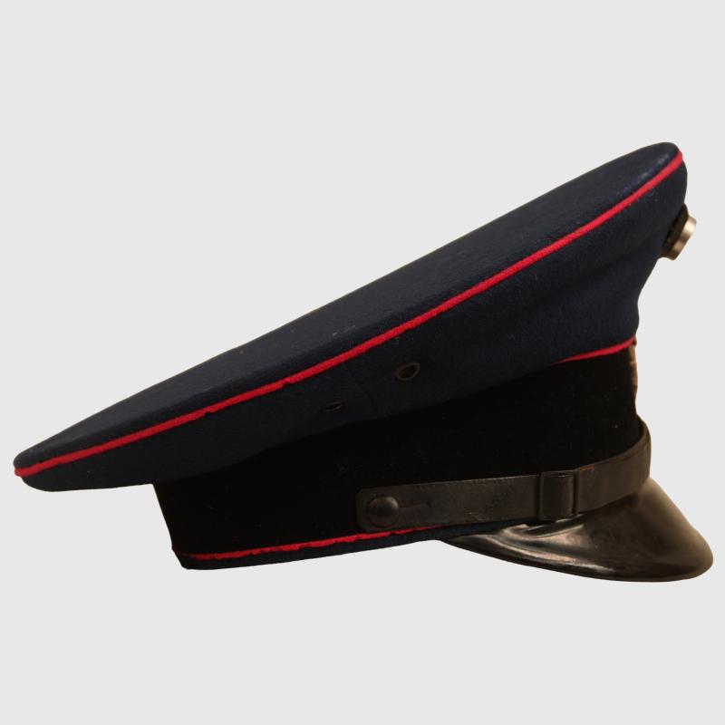 A very nice example , high saddle shape, stamped size ’52 ½’. Good blue body, red piping to the crown and to the upper and lower parts of the black velvet centre band, national cockade. Fire Police nice quality cap badge with original leather strap and black side buttons. To the interior the sweatband is present, the full and complete celluloid lozenge gold blocked ‘Deutsche Wert Arbeit’ with an original owner’s name to a slip of paper below the gold blocking. Slight damage to the red waffenfarbe at the lower part of the black velvet band on the reverse side.