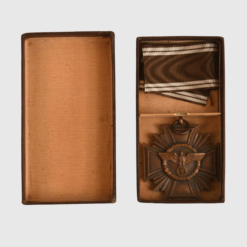 The award having all of its original bronze finish remaining with its separate section of ribbon, all laid into its brown presentation case with the gilded Third Reich political eagle to the exterior lid.