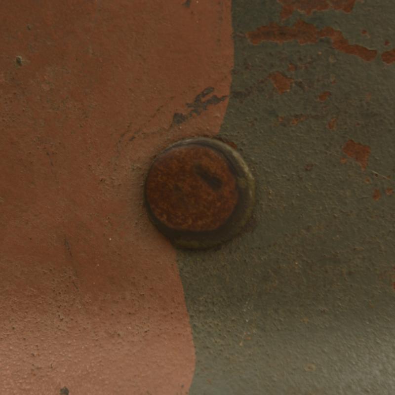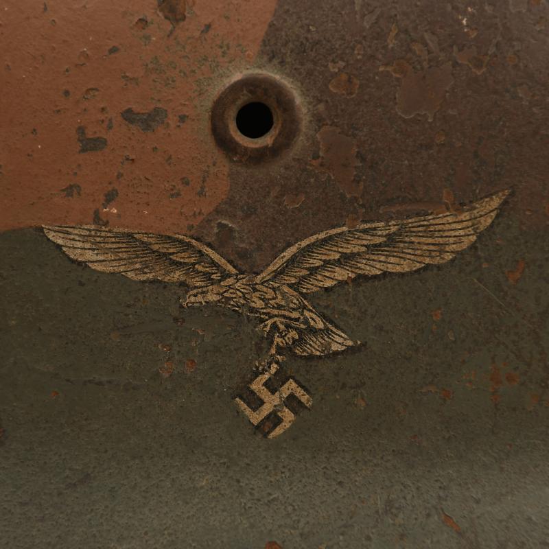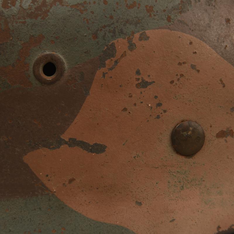 A very scarce and totally original M.40 combat helmet, stamped size Q66. The exterior of the helmet is in a three toned camouflage of green, tan and brown, similar in style to a first war camouflage finish but without separation lines. The original Luftwaffe decal is nice and clear, one small section of the tan has run over the forward wing of the eagle, the camouflage painting has been done very carefully around the eagle, there is a slight run of the green over the bottom leg of the swastika. Some loss to the paint has can be seen in our web images. A name partially obliterated from the inside of the skirt, probably indicating that it was passed from one wearer to another. The interior lining is all complete with its 8 tongues and its original drawstring and its original chinstrap. It would appear to us that the liner was taken out of the helmet for the camouflage painting and then replaced as the camouflage is also on the inside of the helmet below the line of the edge of the zinc liner band. The three liner retaining rivets head have no paint finish on them at all. This was more than likely used by a member of the Luftwaffe Field Division. More extensive, extra images can be seen on our new Premium website, type in regimentalsmilitaria.co.uk in to your web browser.