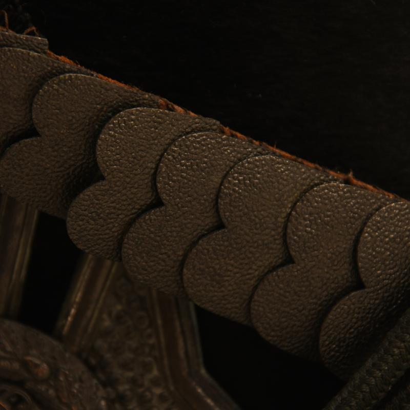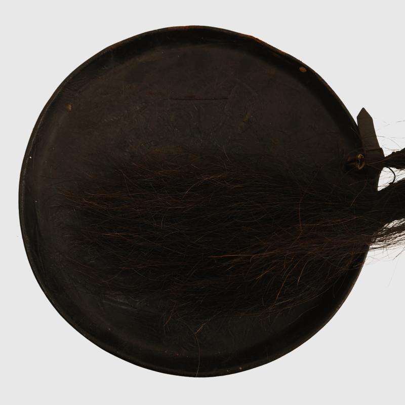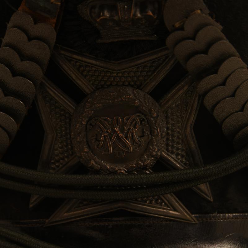 A rare and exceptional condition bell top shako from the reign of William IV, the leather top and peak superb stitching has not rotted, leather has not been pierced or distorted, the Beaver sides again excellent without any moth damage, the helmet does not have a regimental distinction but is possibly a Yeomanry regiment or a Rifle regiment with all the fittings being in black, it’s lions head motifs also in black on either side of the helmet to allow the suspension of the green corded cap lines, one of the individual plates for the chin scales are missing on one side, the horsehair plume in black complete, to the interior the helmet is in a magnificent condition, the red leather sweatband is intact with the remainder of the interior completely lined in red silk which has some slight staining and age foxing but has not shot. More extensive, extra images can be seen on our new Premium website, type in regimentalsmilitaria.co.uk in to your web browser.