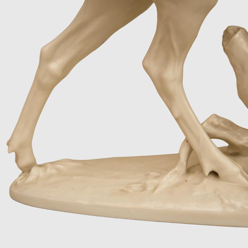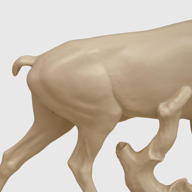 A fabulous example of one of the larger pieces of Allach porcelain produced by the SS on the edges of the concentration camp of Dachau, being the rare white glazed porcelain Rohrender The Roaring Stag model number 20, Designed by the renowned porcelain artist Theodor Karner , according to the excellent Allach Porcelain work by Dennis R Porell only 76 figures were produced in total in white between the years 1938/ 39, 36.2 cm in height, the length from the mouth of the stags rear leg 40 cm, excellent photographs of the stag is shown on page 392 of the aforementioned work, marked T Karner with the SS runic press symbol on the base and the number 20, the piece is totally undamaged and unrepaired, a tip for collectors who want to ascertain if a piece of porcelain has been damage and repaired, is to place the lips against a definite unrepaired section of the item and it should be cold and then placed the lips of the possibly repaired section the temperature should be the same if unrepaired. Although we have over the last 50 years sent out many delicate items by shipping methods and have had a very low degree of accidents, we would not wish to pack and ship this ourselves, the antlers themselves are just too delicate, any prospective purchasers from within the UK should think about collection from our premises, any prospective purchasers from mainland Europe, can arrange with us to bring the item to anyone of the European fairs that we attend, prospective purchasers from outside the UK and Europe would have to pay for a professional porcelain shipping company to have the item delivered, which of course we would arrange. More extensive, extra images can be seen on our new Premium website, type in regimentalsmilitaria.co.uk in to your web browser.