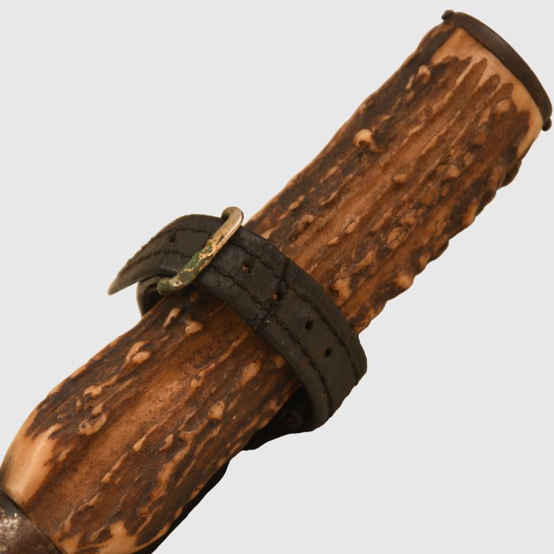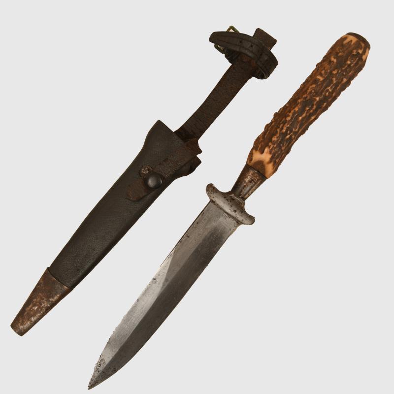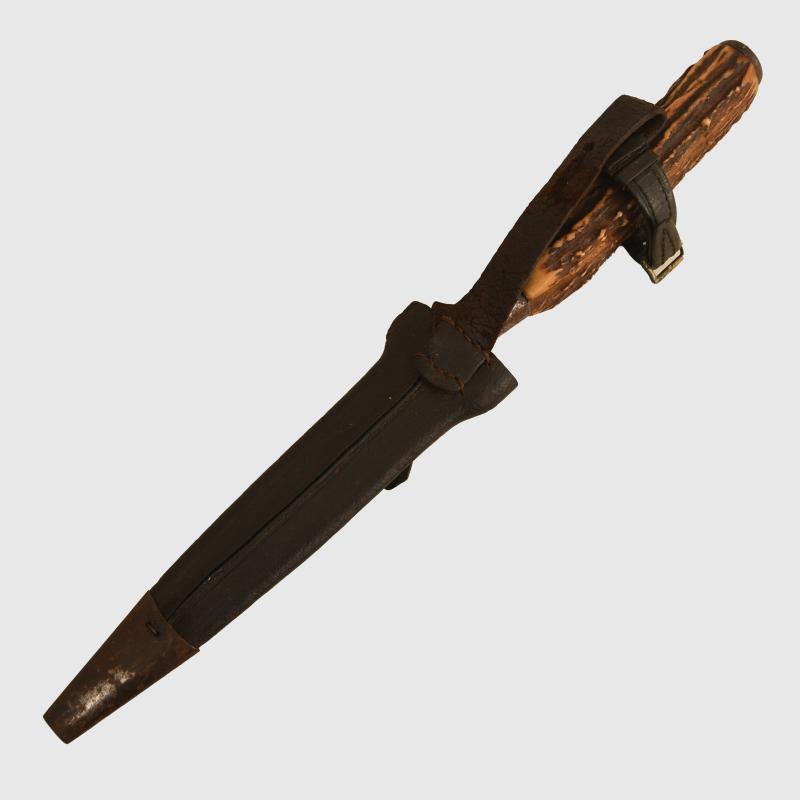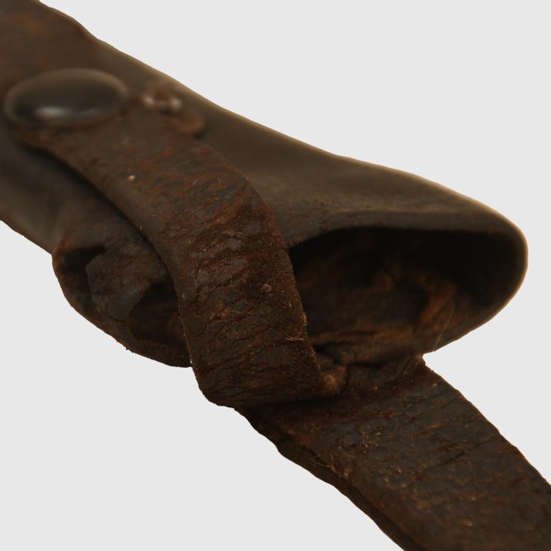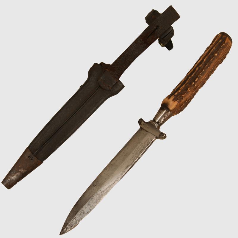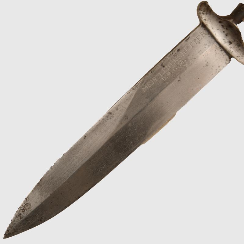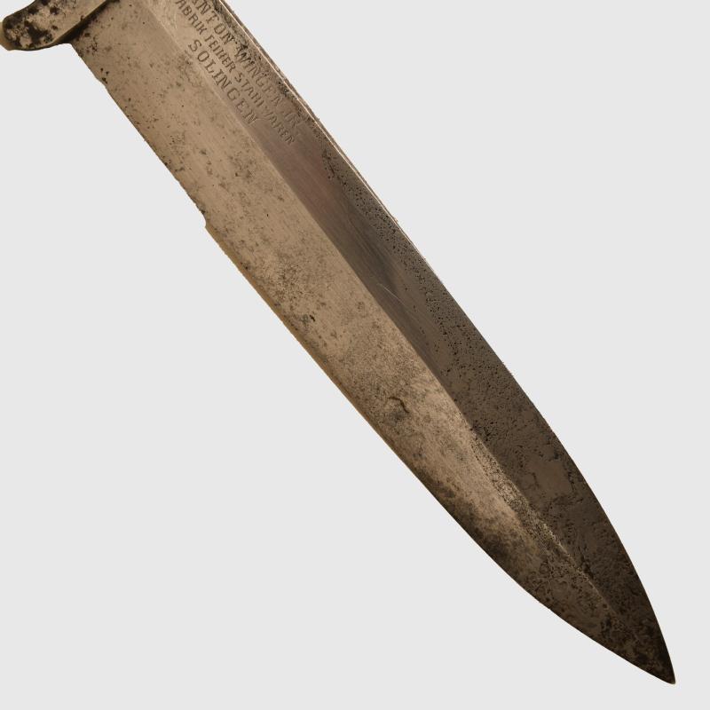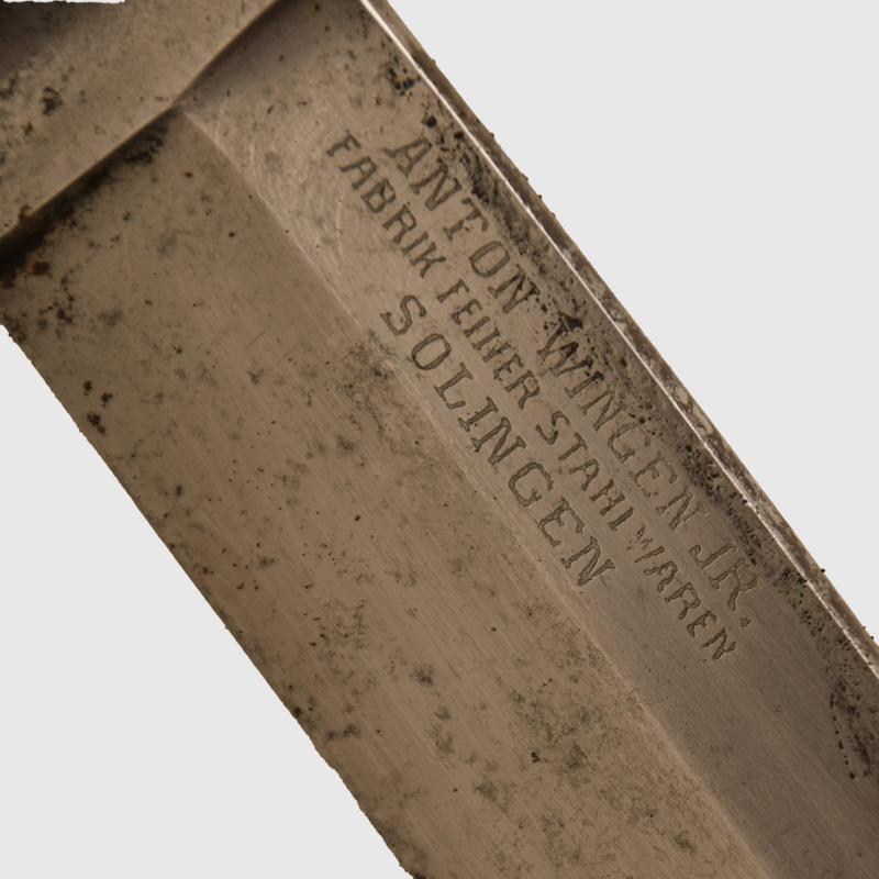 The very popular and hard to obtain in nice condition World War I trench knife produced by Anton Wingen Junior of Solingen, on the reverse side the etched title Mein Lebenstretter, which translates to” my lifesaver” blade generally good some cleaned corrosion to the tip, the steel cross guard nice condition with some black spotting, in its original leather scabbard with its buckle hilt closing strap, the securing point on the buckle is missing, the lower blade securing closure strap also complete with its fully functional male-female closure stud.