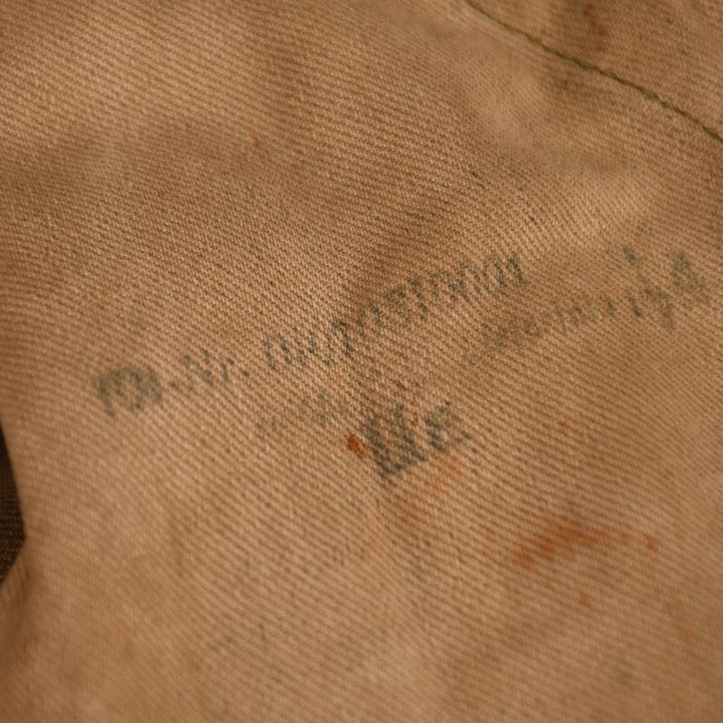 A generally excellent condition well service used Luftwaffe tan and water pattern paratrooper smock. Good heavy duck material, which is more favoured by collectors than the lightweight examples, having all of its original five Luftwaffe blue buttons fitted. The two upper openings to the smock are with metal zips, constructed by Rapid, the two lower zips in plastic are by RiRi, the zips fitted overall were factory fitted and all four zips have their leather pullers. The smock still has its flare pistol holster on the reverse side, we mention this as quite often the flare pistol pockets are removed. One button is missing from the closure flap of the flare pistol pocket. To the upper inside right hand panels when viewing the garment there is the faint remains of the RB number plus the size II in Roman numerals and a partial date of ‘1944’. The lower cuff edges and the lower edge of the garment are frayed. The interior sleeve windproof cuffs have been removed. To the lower left hand side of the garment a period ordnance field repair in canvas has been applied to the inner side of the smock and the female part of one of the male/female press studs is missing, all of the other press studs are complete but rusted and maybe inoperable. Across the two back panels of the garment there are various snags to the material but no actual moth holes. The interior waist pull cord material is intact but the cord itself is missing and there is some rot to the stitching of the pull cord covering material. Standard air vents under each armpit. The smock is fitted with a Luftwaffe light grey on tan tropical breast eagle, it has been machine stitched and there is no evidence to the interior of the stitching coming straight through the material indicating that this eagle was possibly factory fitted. Overall a very good excellent displayable paratrooper smock that has seen good service wear with all its complete functions present. More extensive, extra images can be seen on our new Premium website, type in regimentalsmilitaria.co.uk in to your web browser.