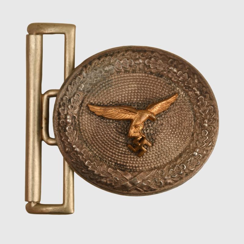 The oval belt buckle in white metal with gold early droop tailed eagle motifs to the centre, with its double pronged keeper. Generally used on the Luftwaffe officers brocade belt.