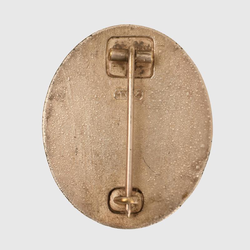 A very nice solid construction Wound Badge in silver, marked number ‘107’ within a block on the reverse side, having its original pin, hook and hinge. Excellent depth of detail.