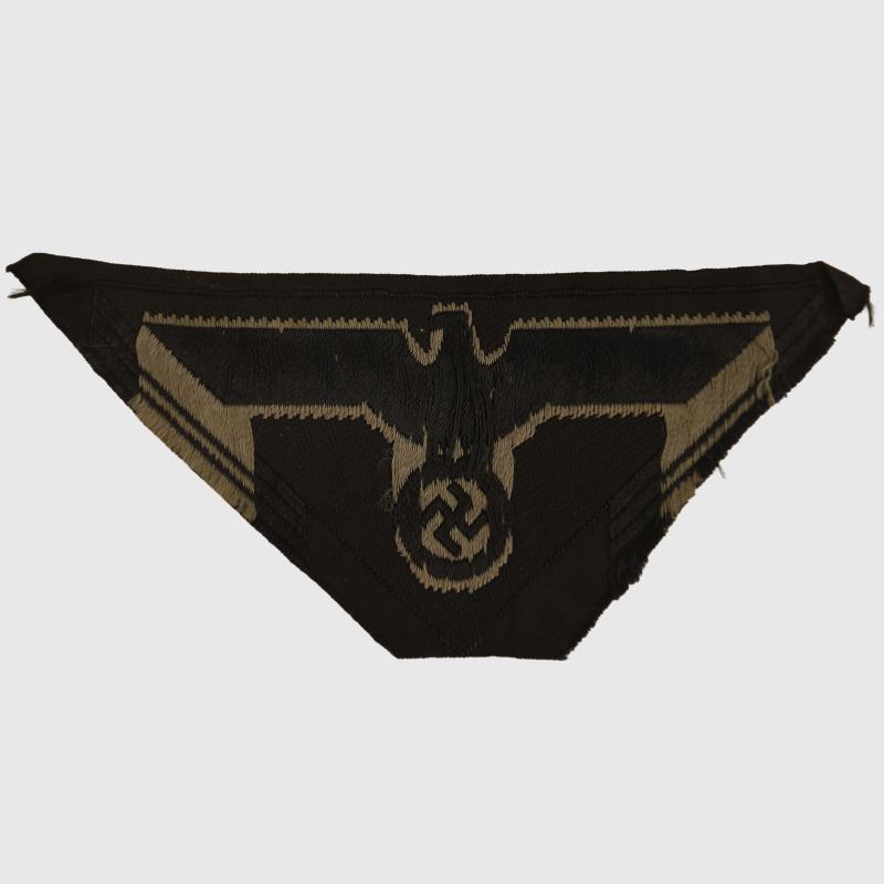 The triangular form Bevo woven grey on black eagle for the mid to late war panzer black wrap over tunic.