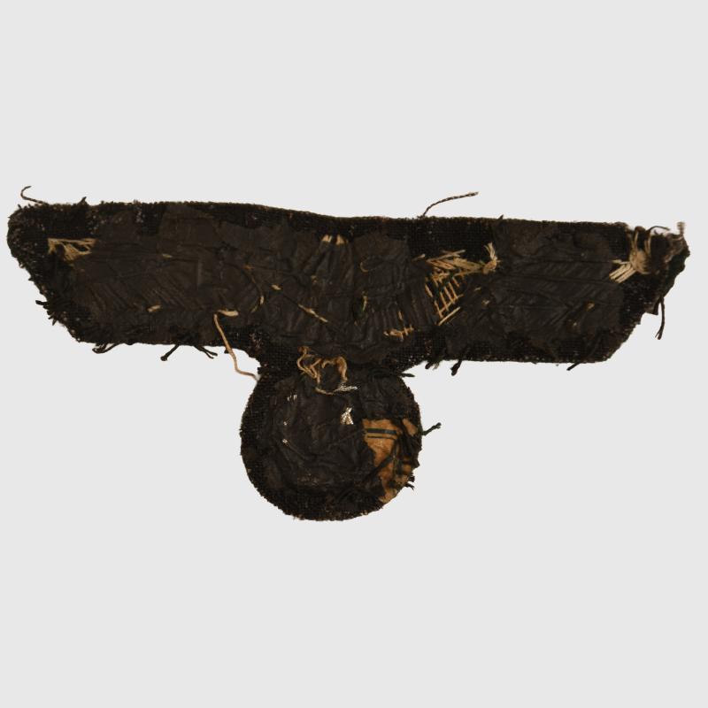 Some small losses to the weave on the left hand wing tip, with its all green backing material. Stitches remain where removed from a tunic.