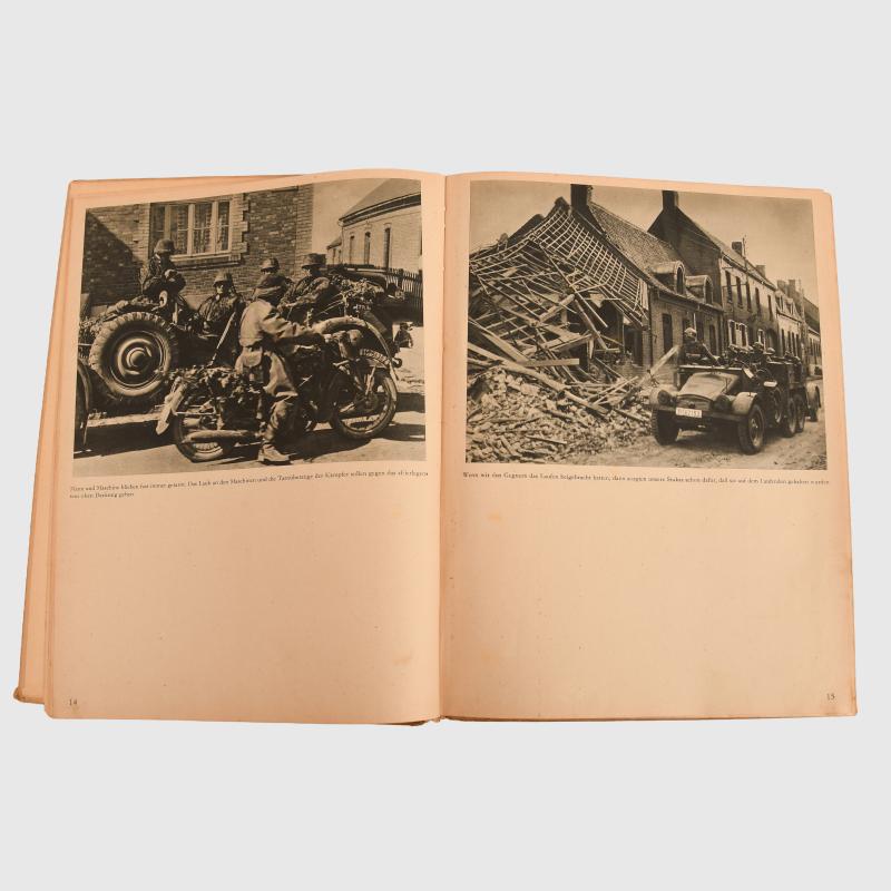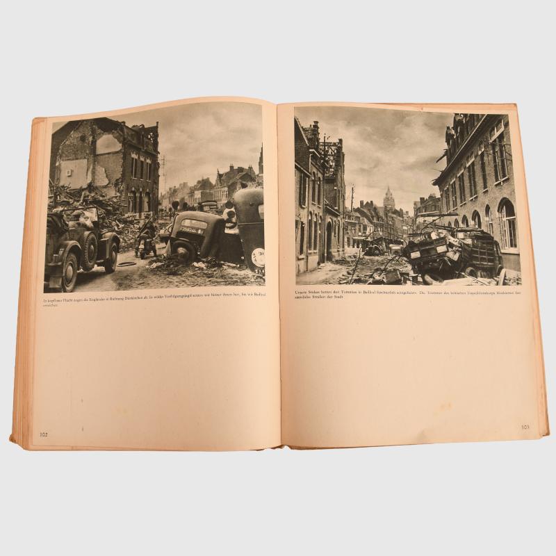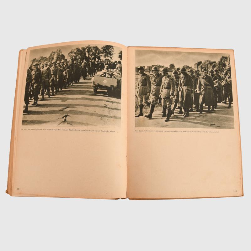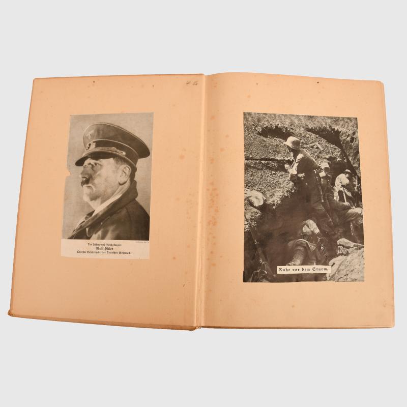 The scarce and desirable work Damals, comprising 118 pages full of black and white photographs of the Totenkopf Divisions actions in the French campaign, with accompanied text and annotations under the photographs. This highly interesting photographic insight into the uniforms, equipment and battles of the Totenkopf Division. On the last but one page a large picture of the Commander of the Division Theodore Eicke, to the front inside two covers an original owner has pasted two period photographs, one of Adolf Hitler another one of what appears to be a WWI trench scene. Some slight age foxing but generally very good condition, without its fly cover.