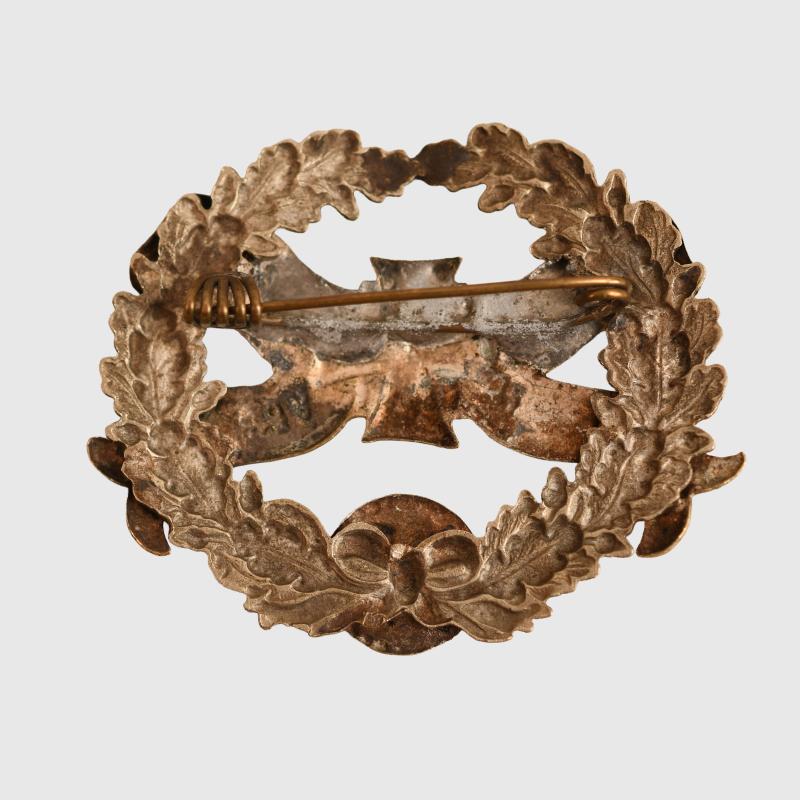 A large size badge being the Hannover Landsturm Veterans 25 year honour badge. Large oak leaf wreath, black painted Iron Cross centre with ‘25’ at the base with lettering reading Hannoverscher Landsturm Verband. Pin back fixing.