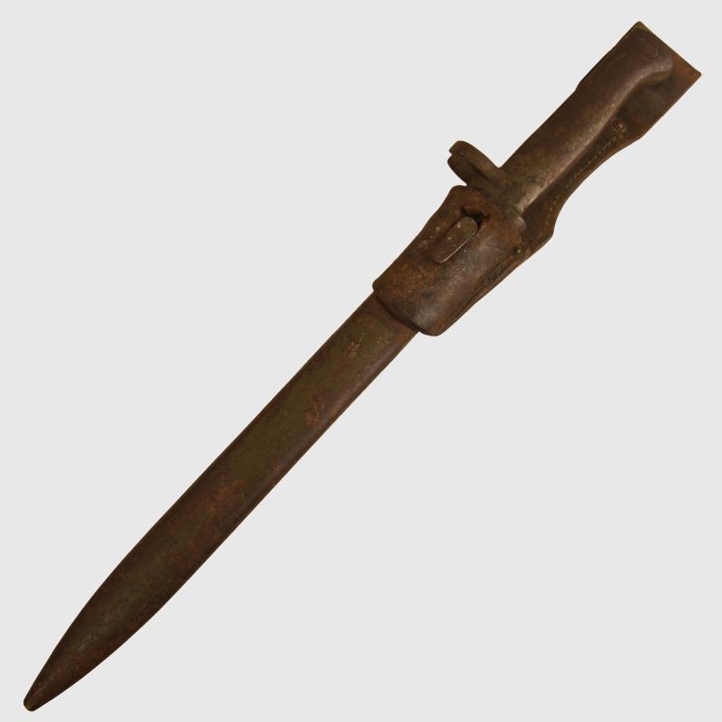 A very nice condition ersatz bayonet with at least 80% of its original field grey green paint finish remaining to the hilt and scabbard, with its original leather frog. The blade is excellent, not sharpened or reprofiled, with its Imperial German acceptance stamp on the flat back edge of the blade.
