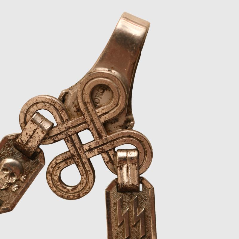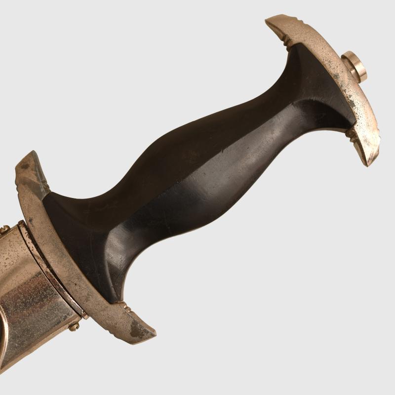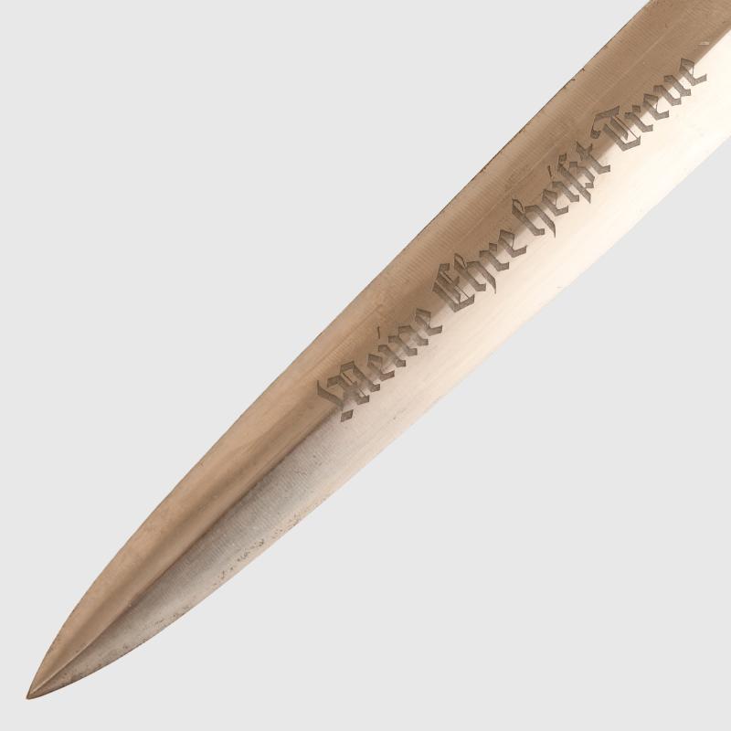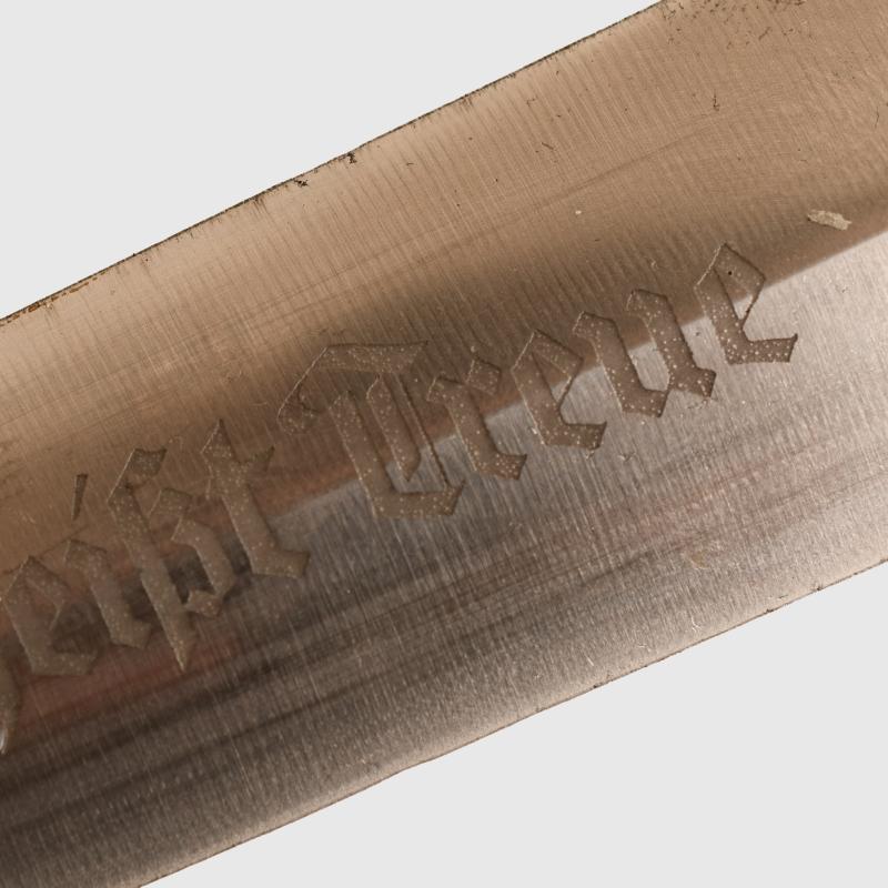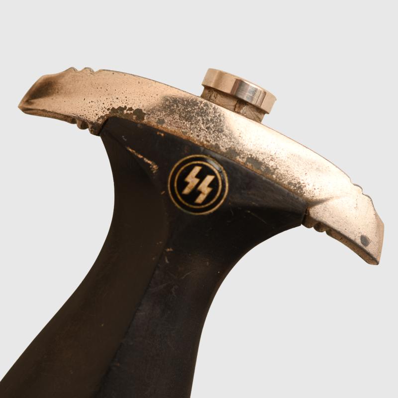 This dagger is completely fresh to the market and has not been in any collectors hands previously. The fittings to the dagger are all steel and plated we estimate the period of construction to be anywhere between 1937- 39, the blade absolutely superb with all its original cross grain finish remaining, the only slight markings being the lines created by the brass inner scabbard blade retaining bands, good deep etching to the SS motto, a nice tight fit into the scabbard, the wood grip having a few minor abrasions and indentations, without any cracks or breakages, undamaged SS enamel inset, nice quality national eagle, the upper and lower grip fittings with plating slightly thin, the plating to the upper and lower scabbard mount excellent on the face side, on the reverse side some minor lifting, the first type hanging chains having light rust spotting, the second link from the scabbard mount having the standard intertwined SS marking in a square, the closing catch of the chains working correctly, the scabbard is of the early blued variety and all of the bluing is complete on the face side, the dagger must have been laying something damp for a period of time the bluing on the reverse side is still all complete but with rust bleed through from the steel below, the rust spotting which is also very lightly on the upper lower and centre chain mount, all of the screws six in total that hold the scabbard mounts to the scabbard are complete and with the heads unturned, the ball on the lower scabbard mount totally un-dented. A very good example. More extensive, extra images can be seen on our new Premium website, type in regimentalsmilitaria.co.uk in to your web browser. The sale of Knives, other Edged Weapons and Firearms are restricted to those aged over 18. Verification of age is required before purchase is concluded, this will include providing a scan of photo ID including your address and in some cases may require video verification by FaceTime or WhatsApp video, at Regimentals discretion, until formal laws on this requirement are enforced in the UK.