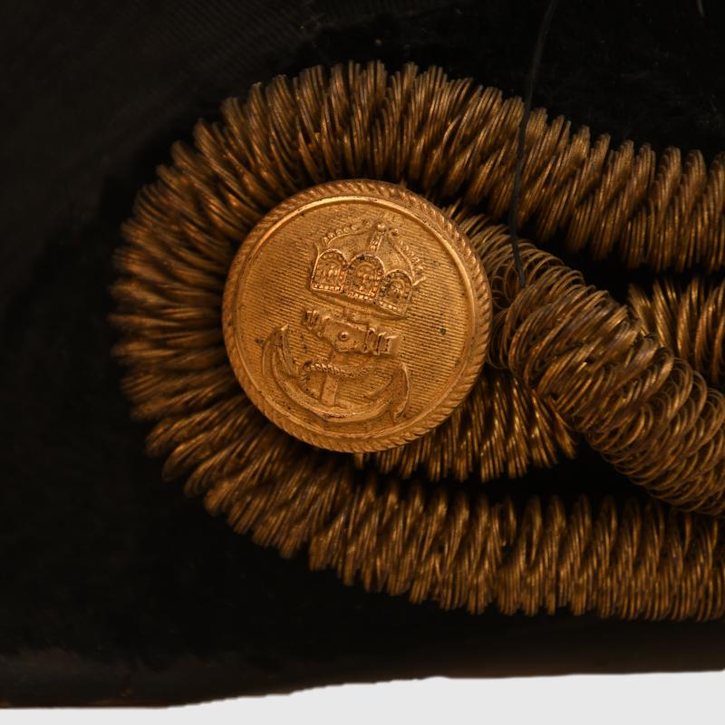 A good form to the headdress complete with its red, white and black Reich colour cockade in silk with its large Reichsmarine crown over anchor button. Gold silver bullion weave. The basic beaver covering to the hat is good with some shredding to the silk trim. The interior leather liner all complete with its silk inner liner.