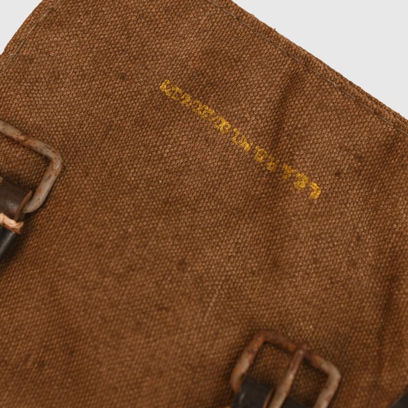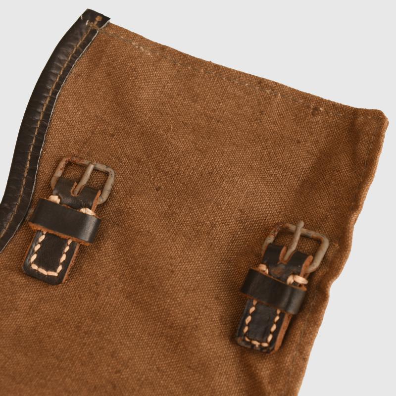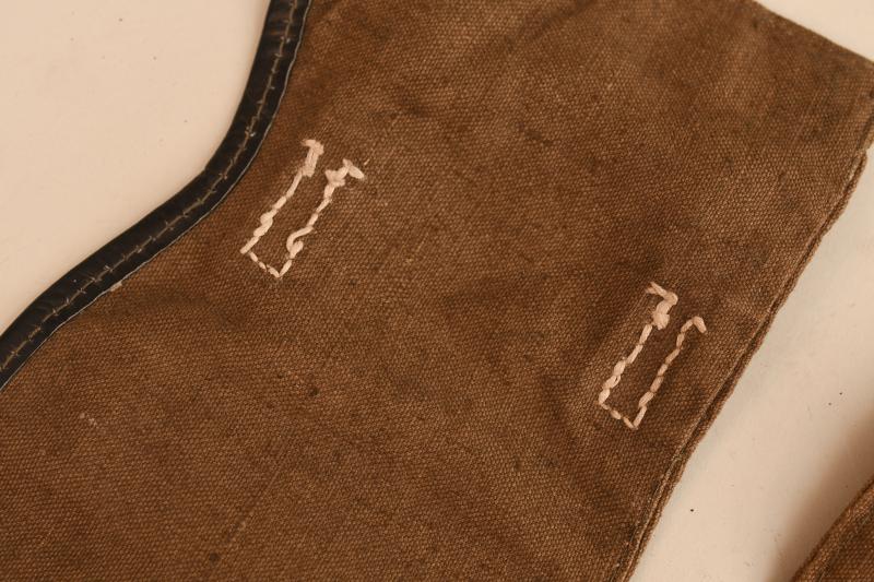 An absolutely mint pair of late war gaiters in a more earth brown colour than olive drab, complete with all of their black leather fittings. Good clean mint condition white stitching with a faint yellow maker’s stamping.