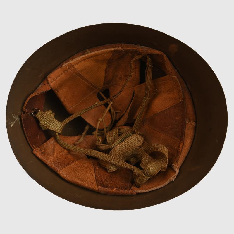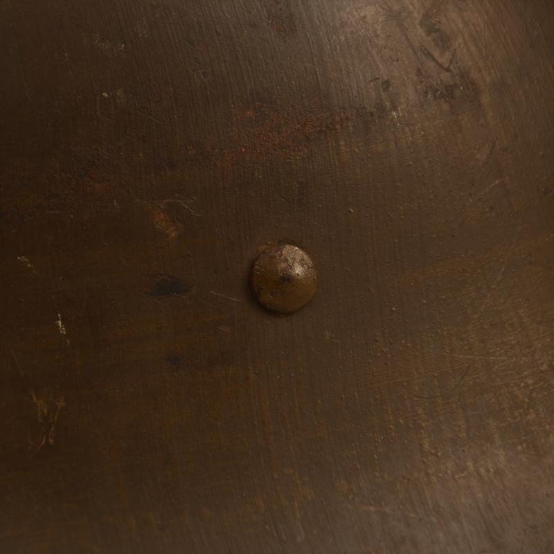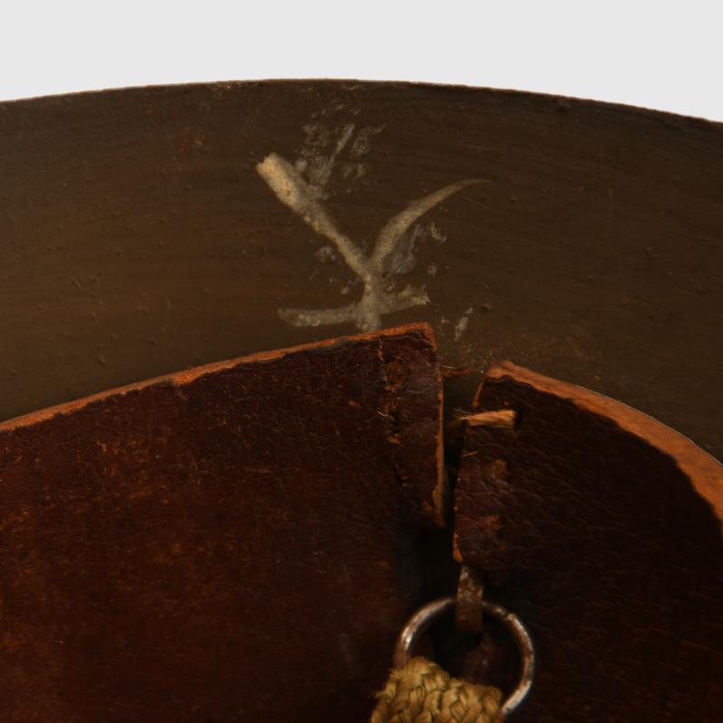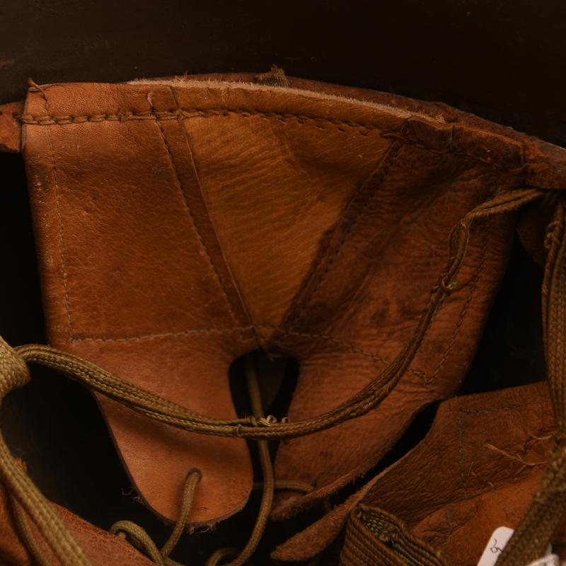 An excellent example of the Type 90 combat helmet worn by Japanese troops during the whole of WWII. The exterior retains all original finish with its army star. Around the lower edge of the helmet can be seen the faint traces of a hand painted line of paint in a very similar but slightly different colour to the rest of the paint finish, this indicated that the helmet which arrived from the factory as a shell only and then was fitted with its separately supplied liner was actually put together in a army facility, the line painted showed that the helmet was now complete and ready for issue. The Japanese Navy had their helmets supplied complete and ready for service, therefore such a overpainted line should not be found on Navy helmets. To the inner rear skirt is the size of the helmet in a single Kanji letter. The liner system is all complete and in good condition, all in a mixture of tan colours. The liners are made from scraps of leather in a triangular fashion from the factory floor and all different colours. We have been informed that this type of construction of the liner only took place in 1941, behind the front liner pad there is a ink block stamping with Japanese characters. The helmet has its original drawstring. The internal liner comprises of three individual pads, two of the pads have their inner cushion still fitted, one has it missing. The neck tie tapes are full length but has been stitched strengthened in places. A excellent example of the Japanese combat helmet of WWII. More extensive, extra images can be seen on our new Premium website, type in regimentalsmilitaria.co.uk in to your web browser.
