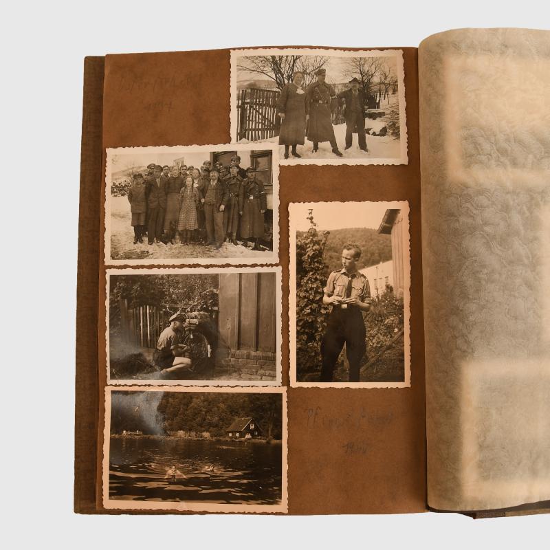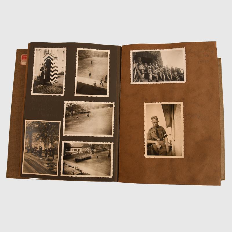 A good grouping of booklets and paperwork including a wehrpass to Otto Heidemann, wehrpass photograph in civil dress, Heidemann born 5th April 1922. Page 11 showing him being a member of 2nd Infantry Regiment Grossdeutschland in October 1941, page 12 shows 10 individual entries dating from 15th October 1942 to the 27th August 1943, all relating to units he served with, all encompassing Regiment Grossdeutschland, page 23 shows the award of the Medal in the East, page 32 shows a record of areas served, page 24 shows that he was killed in the 1943 in Russia. Accompanying documents include his Reichpost savings book with accompanying paperwork, his Reichpost ausweis, his family booklet known Der Ahnenpass, a family ancestry booklet, a letter statement dated 1940 discussing his family history, other associated paperwork. A photograph album whilst a member of the Hitler Youth containing 76 photographs, many images of the young Otto as a member of the Hitler Youth in his HJ uniform with various comrades at camps and mountaineering expeditions, skiing, and other interesting aspect of Hitler Youth life. One annotation shows him attending the Gebietsfuhrer Schule, Langemark. A highly interesting group of a motivated Third Reich child who eventually joined with the elite Regiment Grossdeutschland. More extensive, extra images can be seen on our new Premium website, type in regimentalsmilitaria.co.uk in to your web browser.