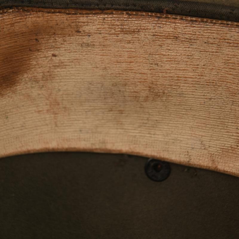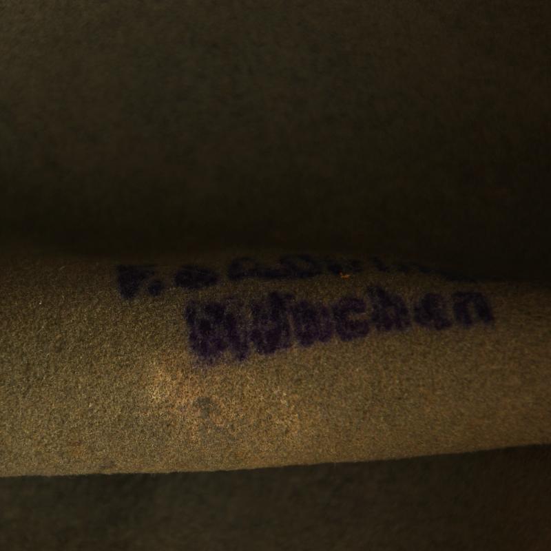 A very fine example of the NCO and other ranks example for the Schutztruppe in South West Africa. The hat band and the hat trim are all in green and are of the exact weave and quality designated for NCO and other ranks. For a direct comparison please see The German Colonial Troops 1889 to 1918 page 284. The hat brim is held to the main body of the hat with a press stud, there are various age storage stains, one minor moth nip, some slight moth tracking to both the outer and lower brim. Maker stamped to the inside of the hat for the famous store in Munich ‘F & A Oiringar’.
