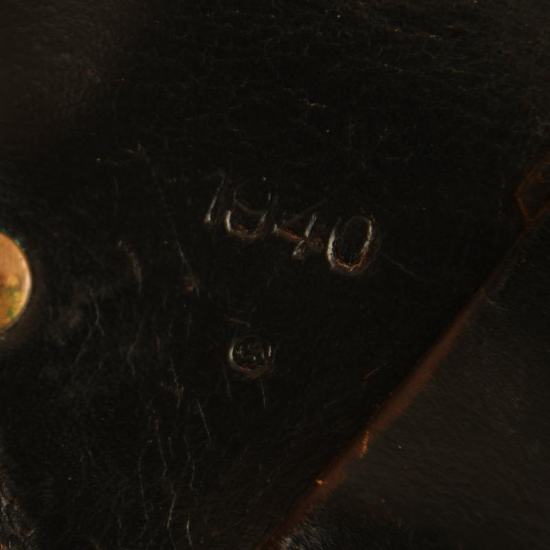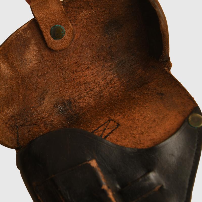 The small leather holster possibly for a Sauer of Beretta, maker coded on the back very faintly ‘CEY’ which is the Company of Karl Budischovsky Leather Industries of Vienna, Austria. Also dated ‘1940’ with a faint police acceptance stamp below. The other unusual thing about this holster is that it is a left handed holster. If any of our website viewers have any ideas as to the type of this holster we will be glad to hear from them.
