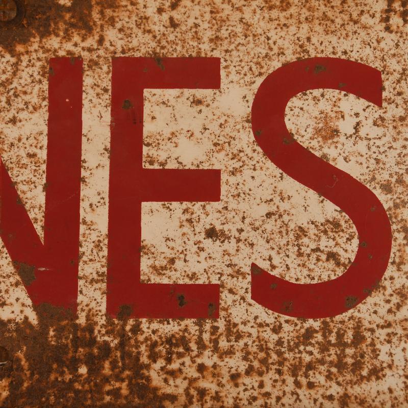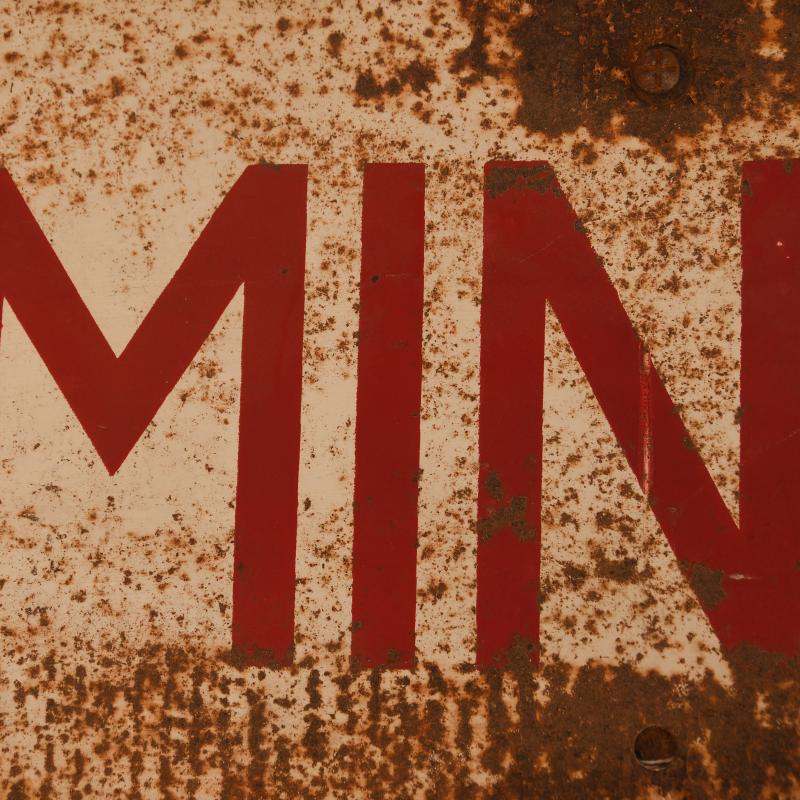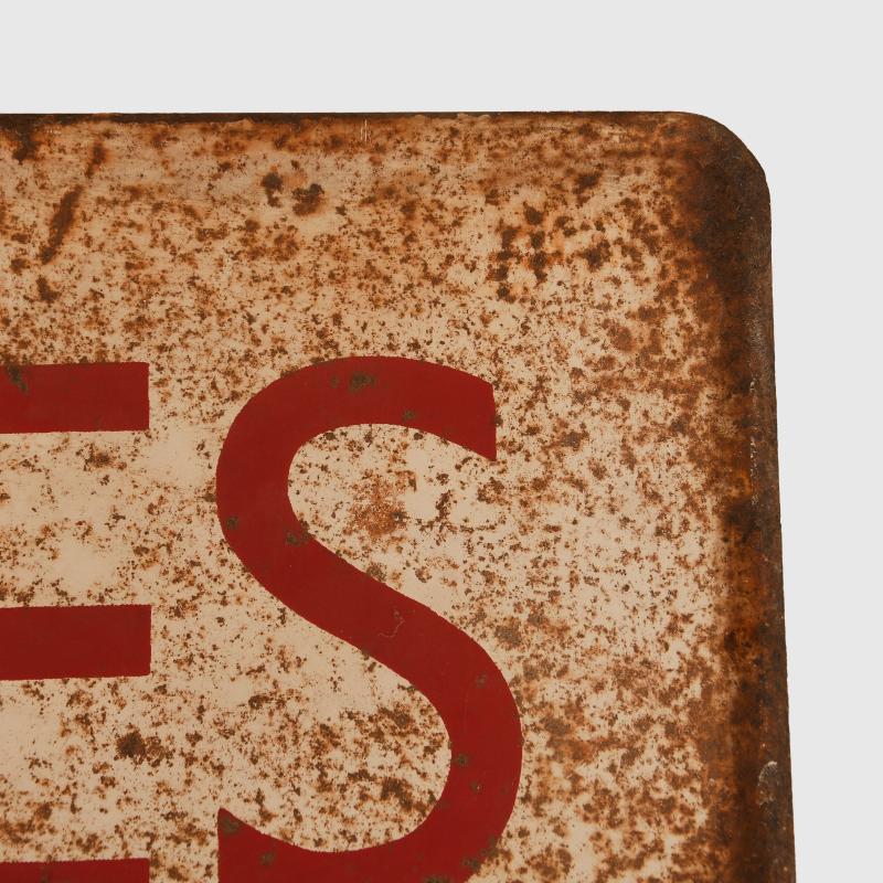 A slightly rusty white painted with red lettering road side sign placed by forward reconnaissance troops advancing ahead of the main forces and warning of the advancing troops of presence of mines. The sign measure 29cm x 65cm, with its original prop, one of the threaded screws and nuts holding the prop in place is missing. An interesting and historical signage from the advance of the British Army through Northern Europe in WWII.