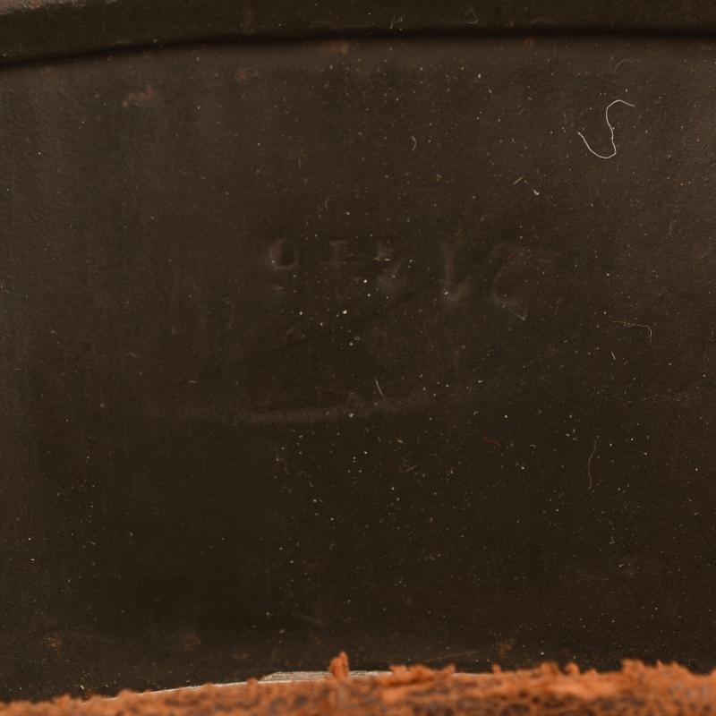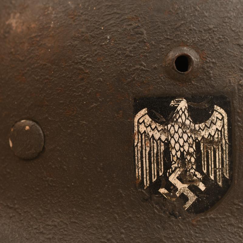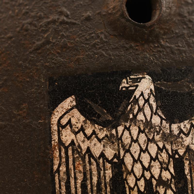 Originally a double decal M35, the helmet has been factory or depot refurbished with the removal of the tri colour decal, the outline of the tricolour can be seen also the paint over the years has congealed in a different way over the decal area than on the shell, the original army decal is nice and clear , the refurbished light wood chip finish has strayed slightly over the lower left hand arm of the Swastika, the remainder of the grey wood chip finish, virtually all complete, shell size EF66, batch number 21446, the M35 aluminium liner band all complete, strap missing, the liner itself has one tongue missing and a large tear below another tongue, one wearers name to the leather liner, Ink stamped 58.