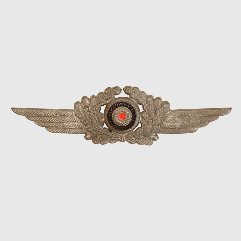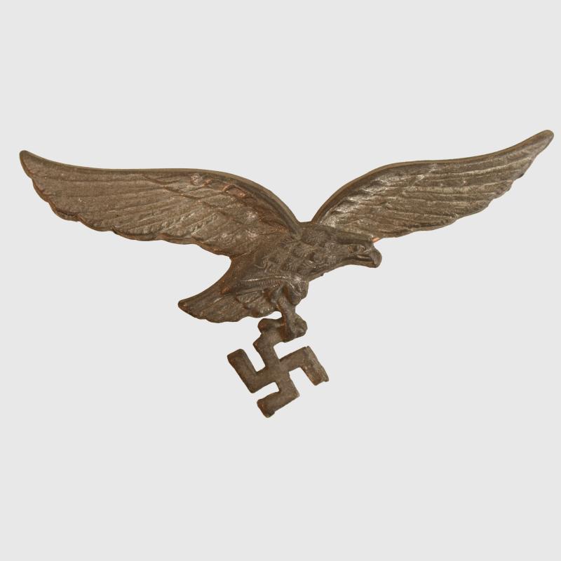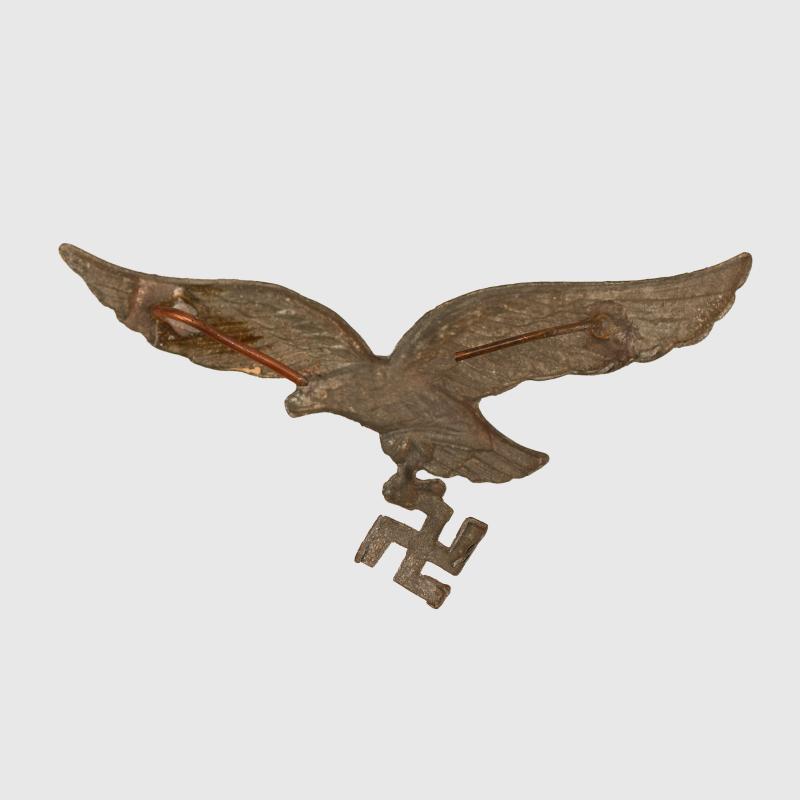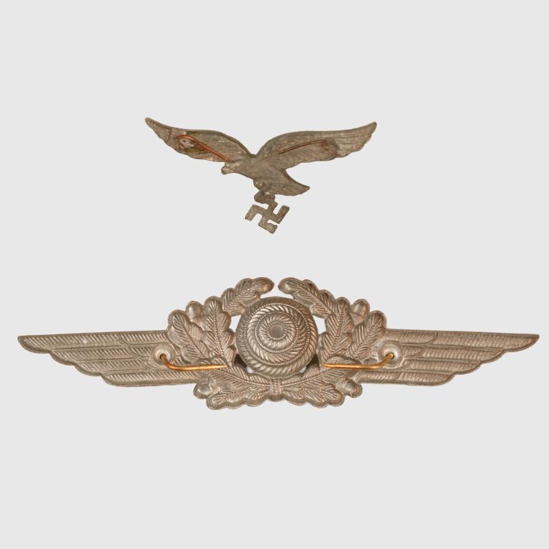 A subdued colour set of the correct eagle and cockade for the Luftwaffe enlisted ranks or nco visor cap. One pin to the eagle appears to have been glue strengthened.