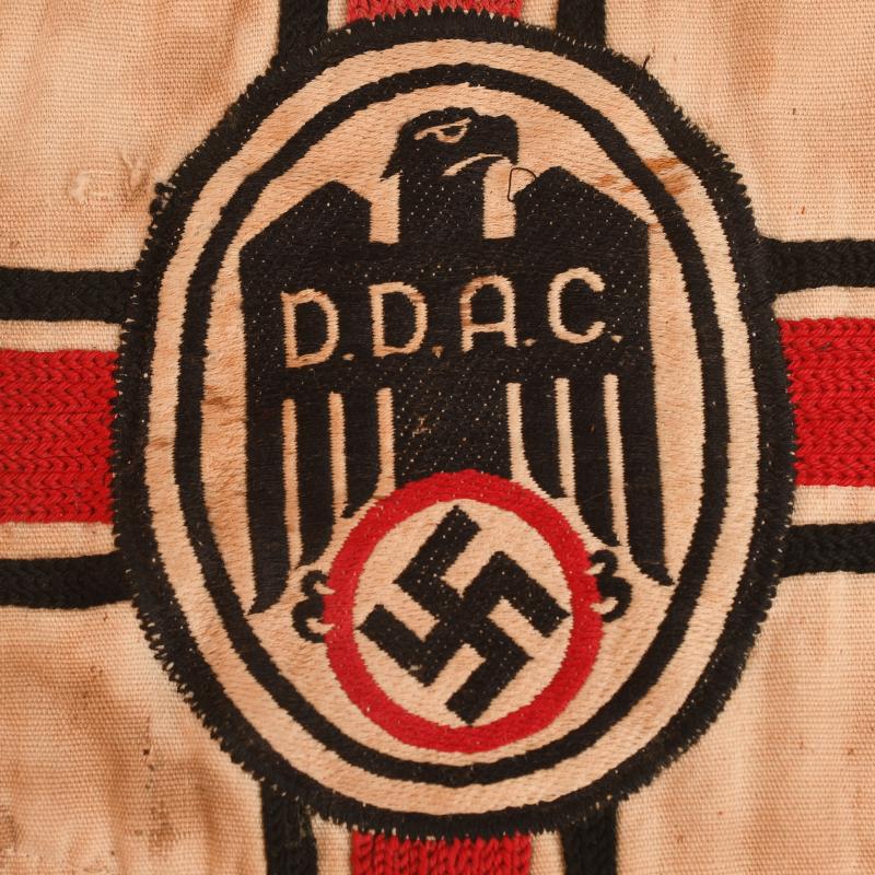A nice high quality constructed car pennant, 19.5 x 35cm. The complete DDAC insignia on both sides and the red, white and black lines running through the pennant have all been hand embroidered. The amount of work involved for a small piece such as this is incredible. The white field slightly stained.