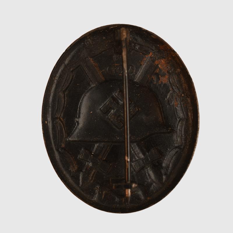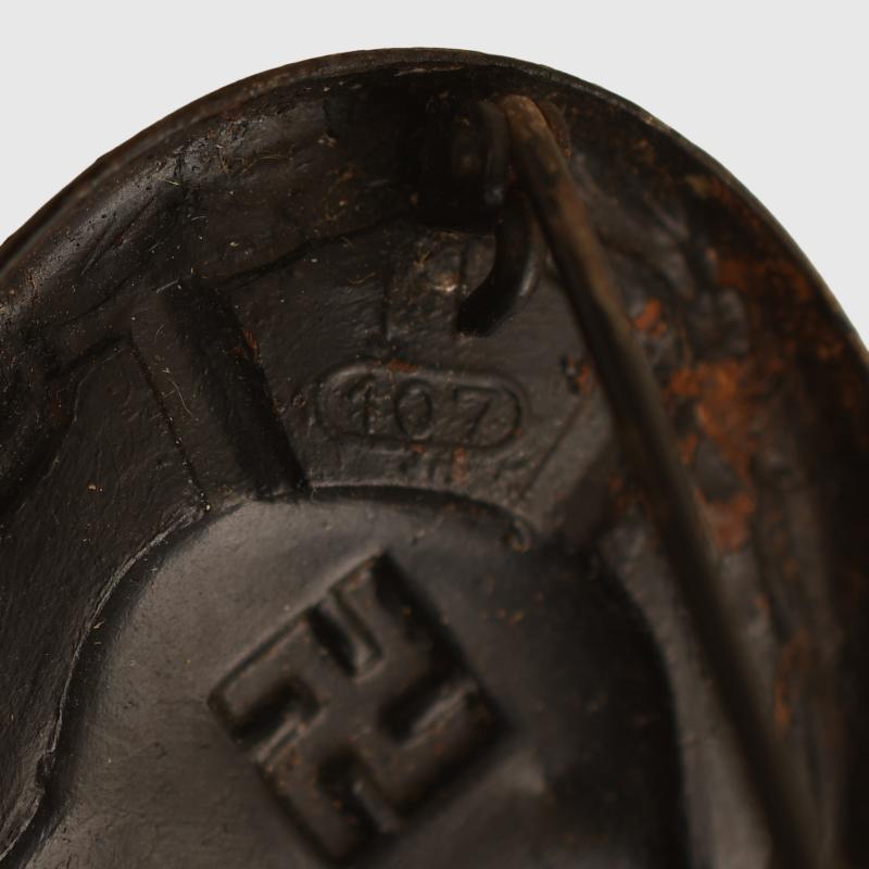 A single stamped version of the Wound Badge in black. Some slight paint loss to the left hand side of the wreath and to the swastika itself. Stamped 107 in raised relief on the reverse side. Original pin, hook and hinge.