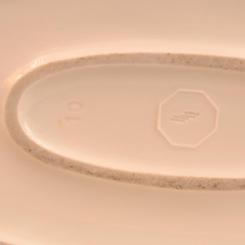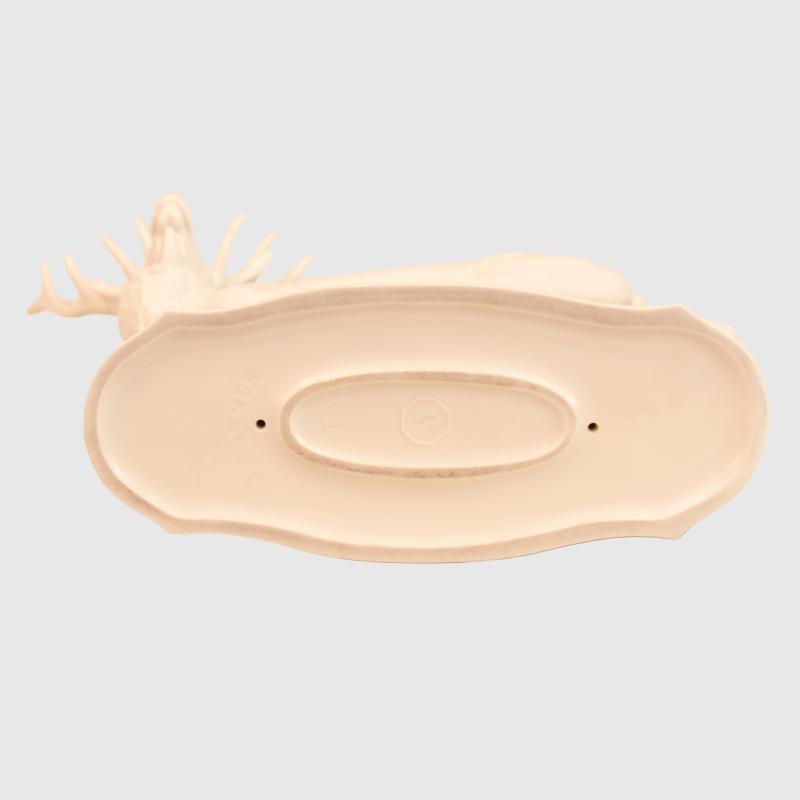 A beautiful example of the Allach white porcelain mountain stag, designed by Theodore Karner. The figure was introduced in 1936, as shown in the 1936 catalogue. Approximate production numbers were 93 for the total white versions produced between1938/39. The mountain stag is heavily detailed and impressive. In the work Allach Porcelain 36-45 by Dennis R. Porell Dennis describes that the antlers are removable and the item pictured in the afore-mentioned work on page 386 does appear to have antlers that were applied after the main body was finished, on our example the join of the antlers to the main body is nowhere near as distinct and is very finely finished in the join area. There is no damage in any place or any replacement parts on our mountain stag. The SS Porcelain Works at Allach on the edges of the town of Dachau and next to the concentration camp was created by Heinrich Himmler's SS to create by the finest artisans in Germany, beautiful pieces of white and coloured porcelain. The previously mentioned work of Allach Porcelain two volumes is a beautiful work and we strongly advise any potential collector to obtain these books.