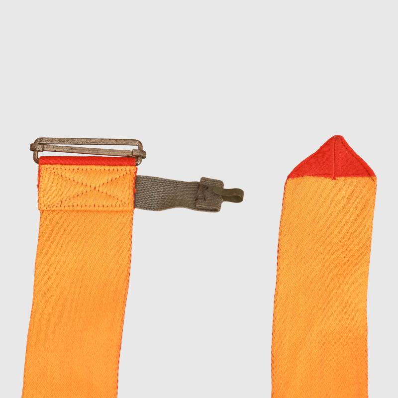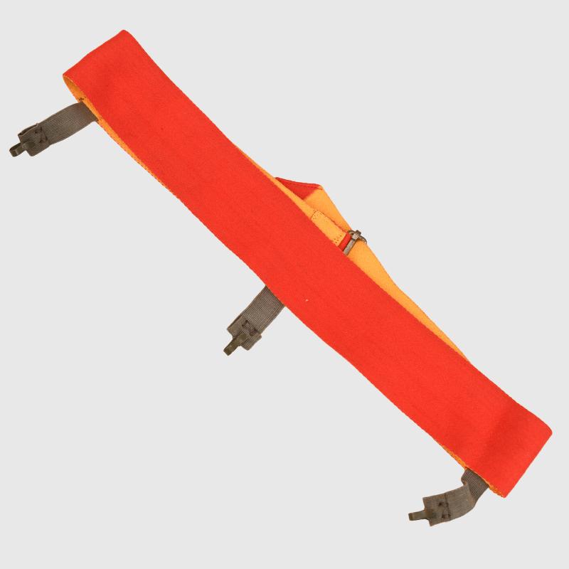 Reversible Red to Yellow cotton with metal buckle and hooks to go under the edge of the helmet, unissued condition.