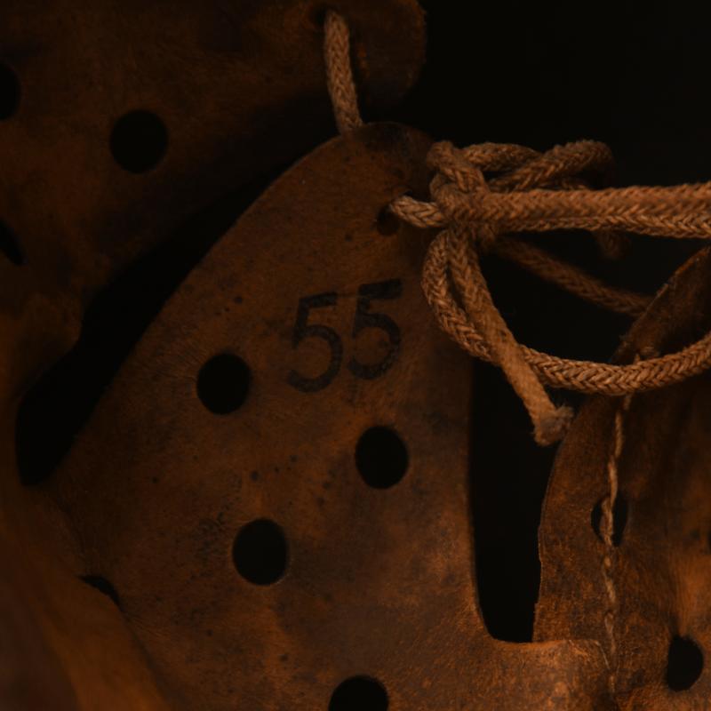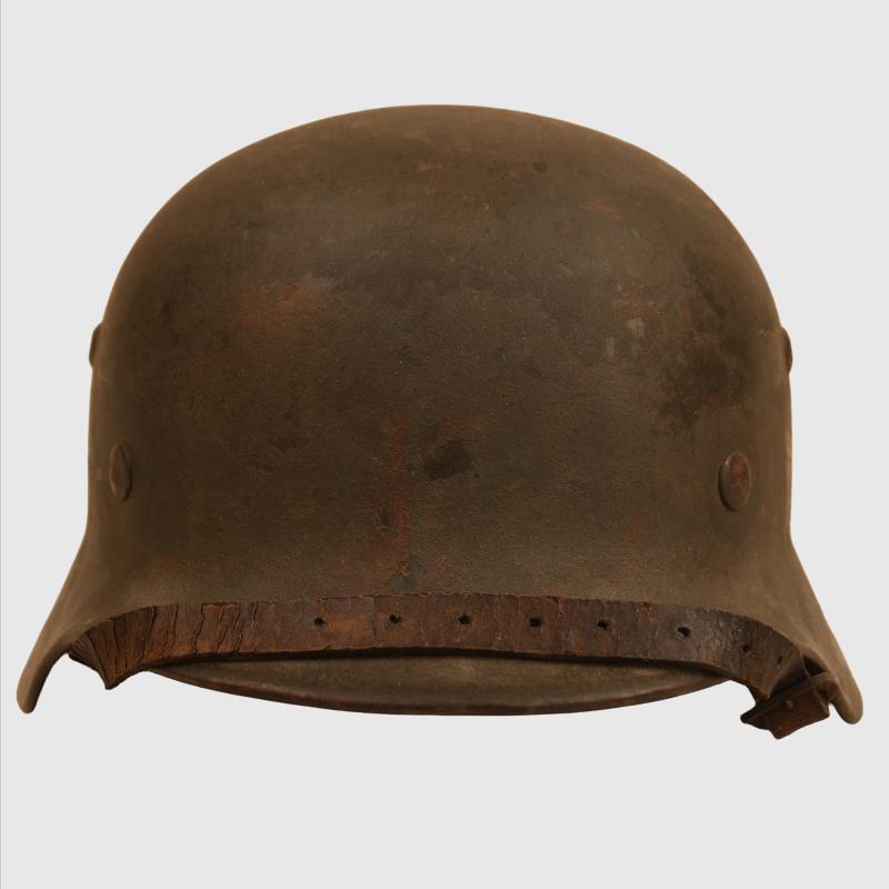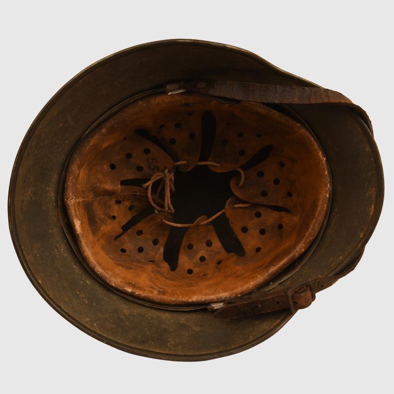 A nice condition liner size ‘55’ M.35 double decal combat helmet that under the 1940 regulations has been over-painted and hidden the national tricolour. Over the years the paint has cracked over the transfer and the colours can clearly be seen below. The army decal is good and clear. Some minor paint losses but a good 1940 addition over the early apple green. The paint has virtually removed itself from the three liner retaining studs. To the interior the size 55 liner all complete, good and supple but with evidence of much storage and a certain amount of wear use, with its original drawstring, its standard aluminium liner band and its chinstrap, which is all complete but dry. The shell size obscured by the 1940 overpaint.