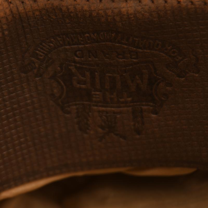A World War I style cap In light beige colour, produced World War I and worn later with the wider World War II style chinstrap, good trench flopy style fitted with the 1929 badge of the Dominion Fusiliers, maker or retailer stamped into the cross hatched leather sweatband, ”The Muir brand”.