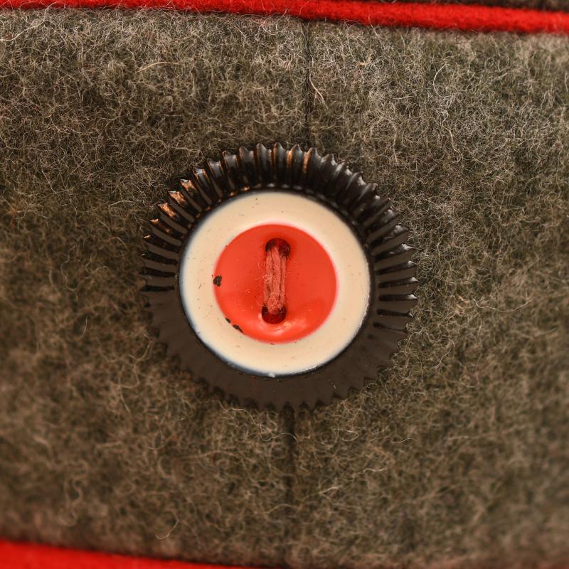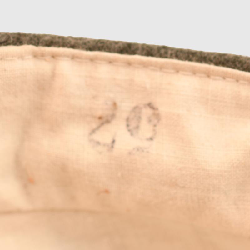 A number of years ago we managed to find a quantity of enlisted ranks feldmutze both Prussian and Wurttemberg, we are down to the very last. This one has all the map of the cloth, still having a central fold mark where it was folded flat. Prussian enlisted ranks cockades, standard field grey material with red band and red waffenfarbe around the crown. Virtually pure white lightweight cotton lining. Marked size ‘53’ ink stamped size ‘57’ in two place, ‘Koblenz’ maker marked.